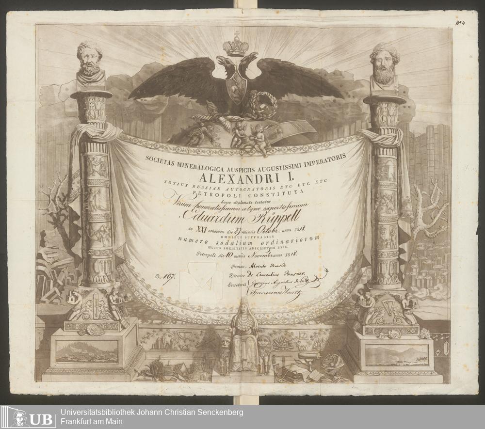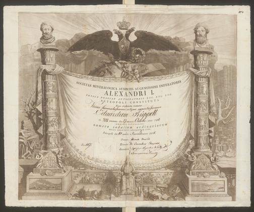 gr. 2˚ Hs 1 - Dr. Eduard Rüppell betreffende Diplome und Ehrenschreiben aus den Jahren 1818 - 1879. Nr. 1 - 64, nebst Verzeichnis