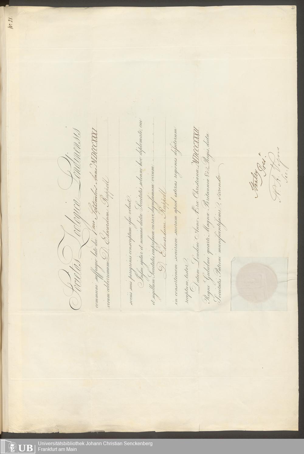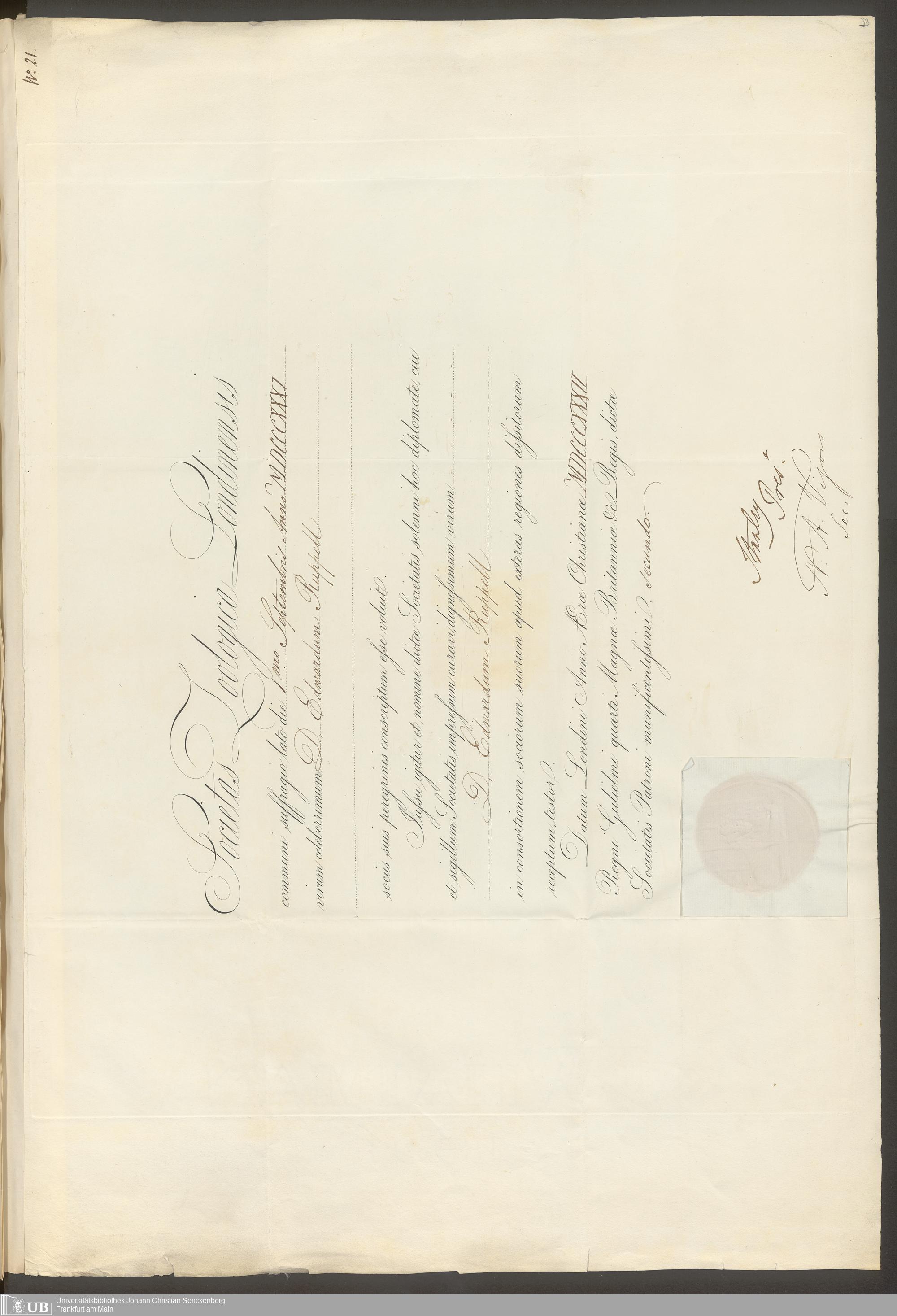 gr. 2˚ Hs 1 - Dr. Eduard Rüppell betreffende Diplome und Ehrenschreiben aus den Jahren 1818 - 1879. Nr. 1 - 64, nebst Verzeichnis