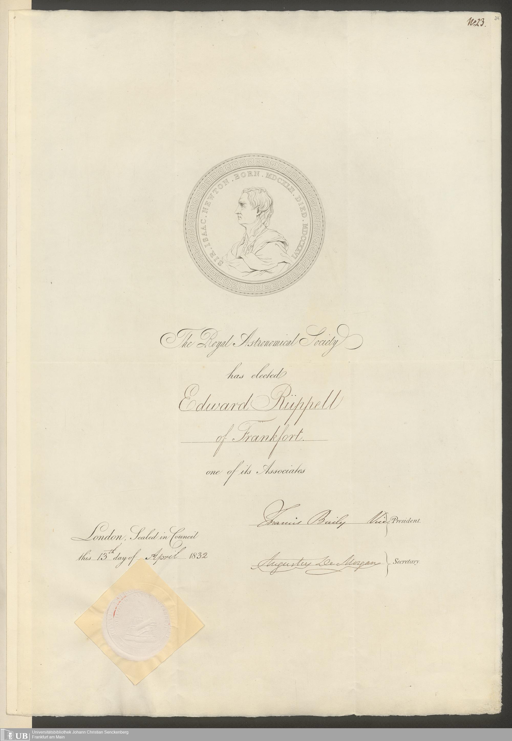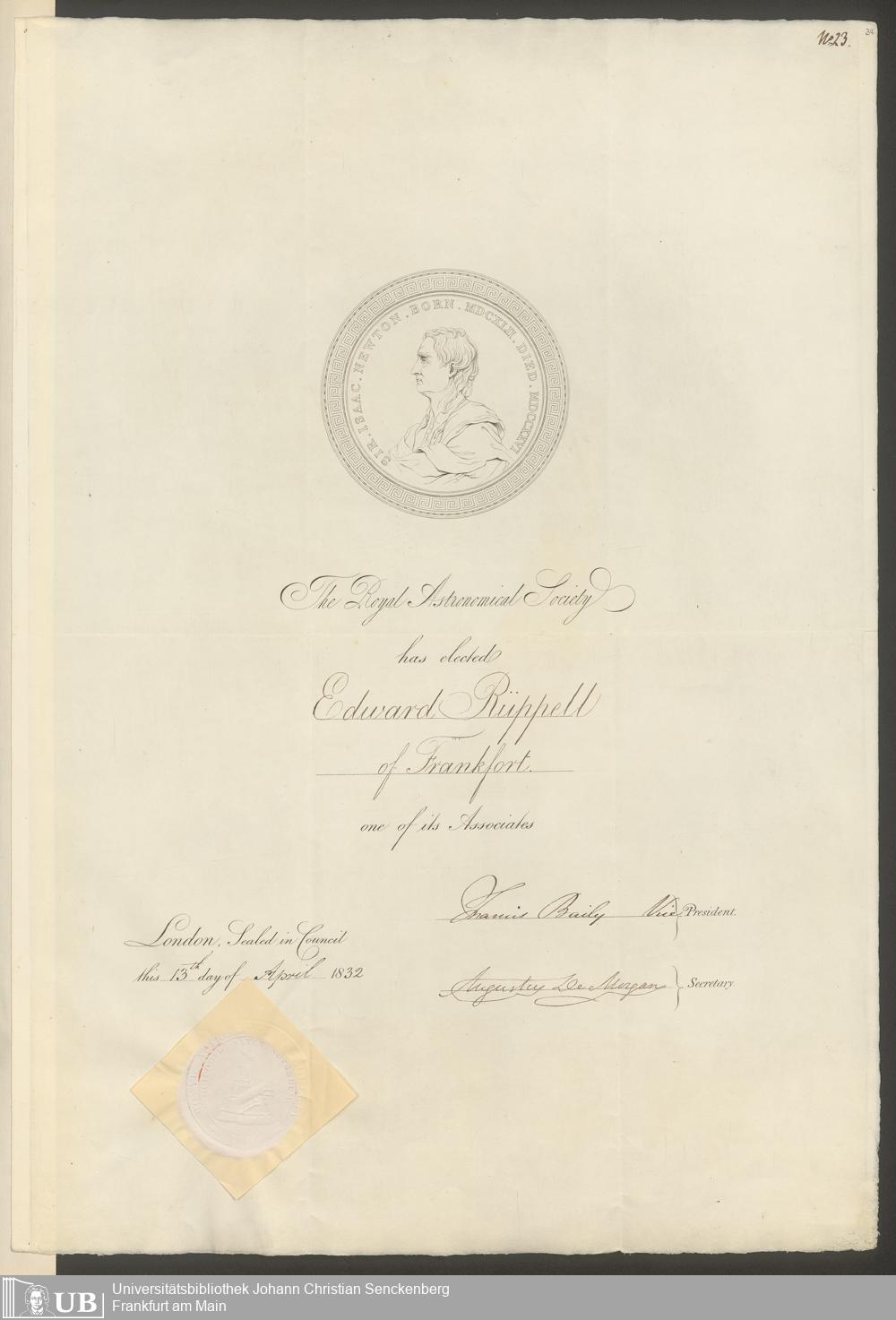 gr. 2˚ Hs 1 - Dr. Eduard Rüppell betreffende Diplome und Ehrenschreiben aus den Jahren 1818 - 1879. Nr. 1 - 64, nebst Verzeichnis