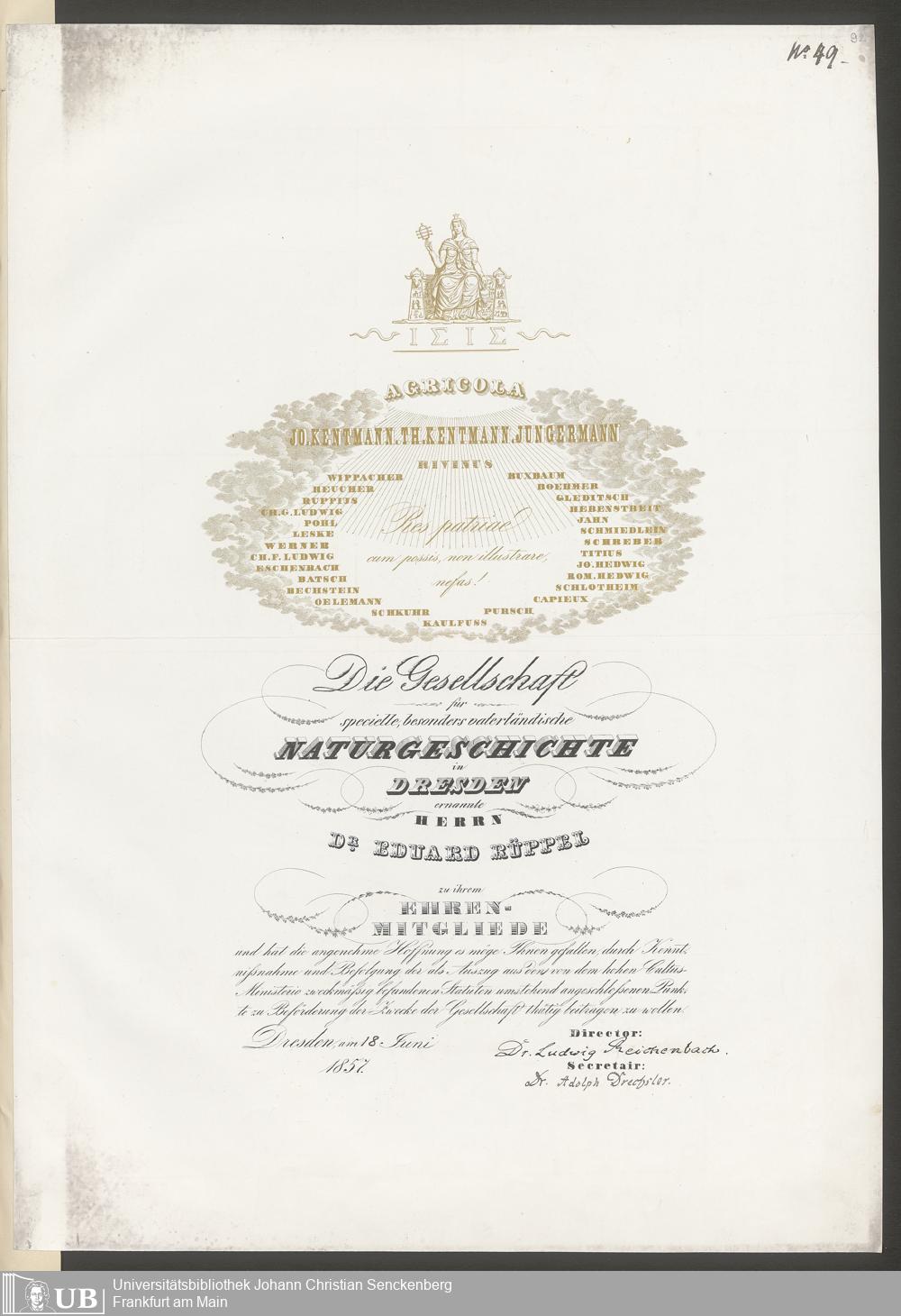 gr. 2˚ Hs 1 - Dr. Eduard Rüppell betreffende Diplome und Ehrenschreiben aus den Jahren 1818 - 1879. Nr. 1 - 64, nebst Verzeichnis