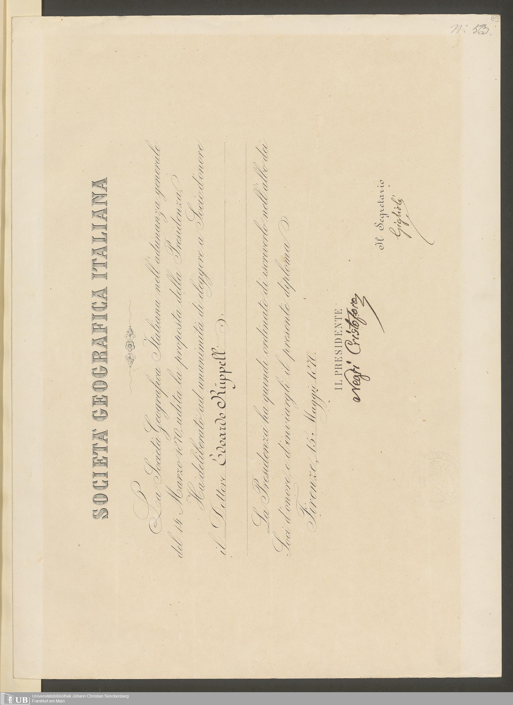 gr. 2˚ Hs 1 - Dr. Eduard Rüppell betreffende Diplome und Ehrenschreiben aus den Jahren 1818 - 1879. Nr. 1 - 64, nebst Verzeichnis