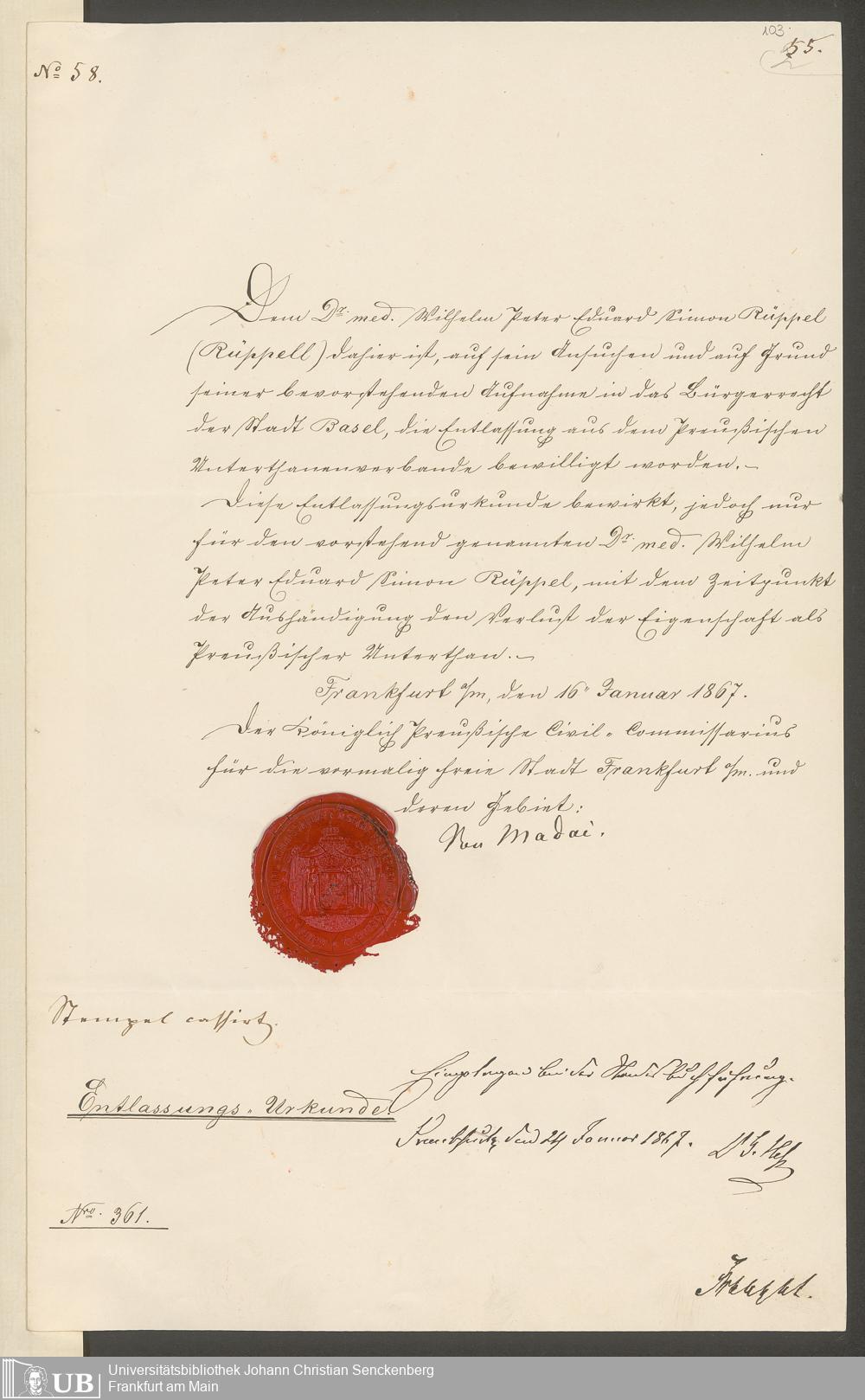 gr. 2˚ Hs 1 - Dr. Eduard Rüppell betreffende Diplome und Ehrenschreiben aus den Jahren 1818 - 1879. Nr. 1 - 64, nebst Verzeichnis