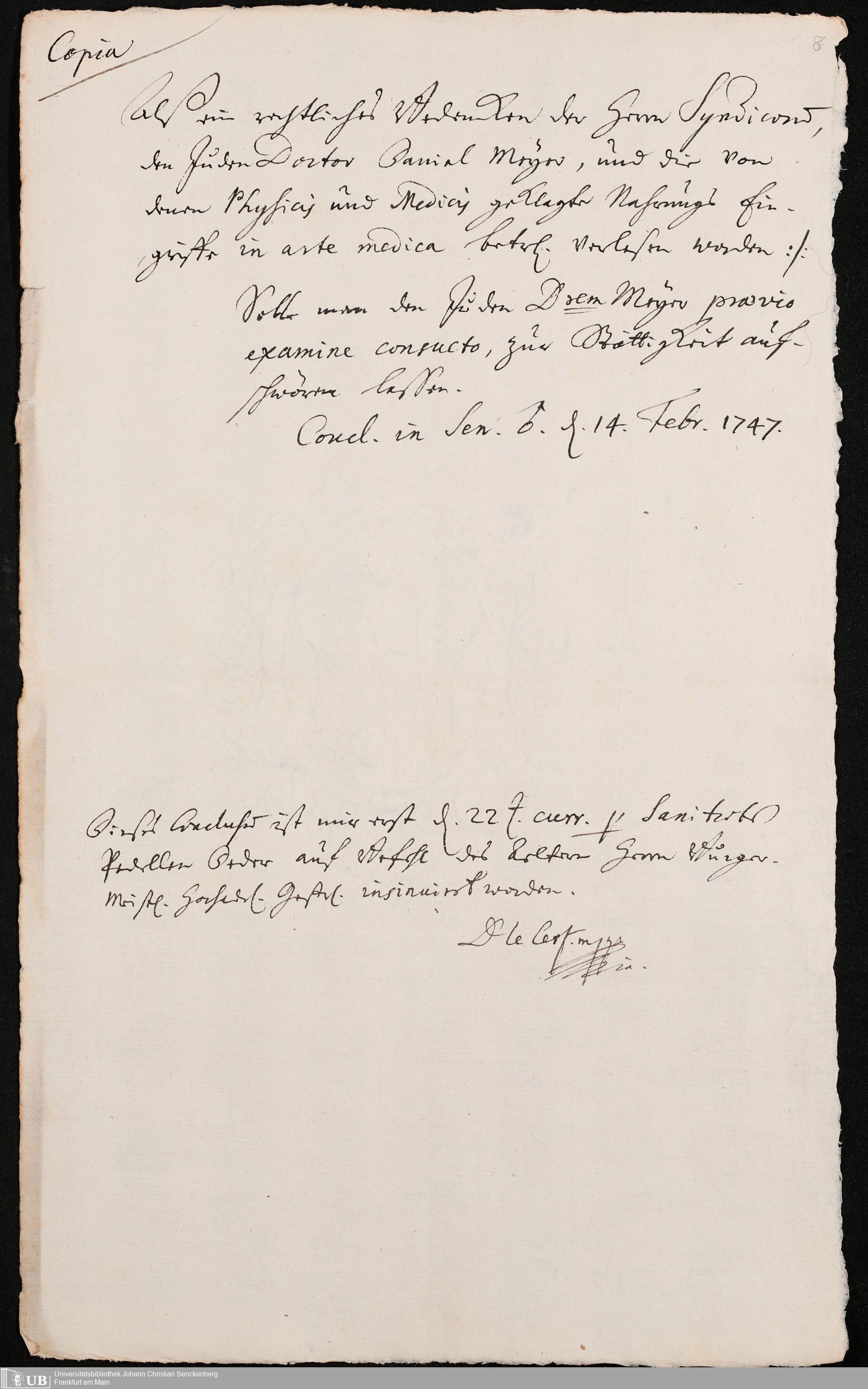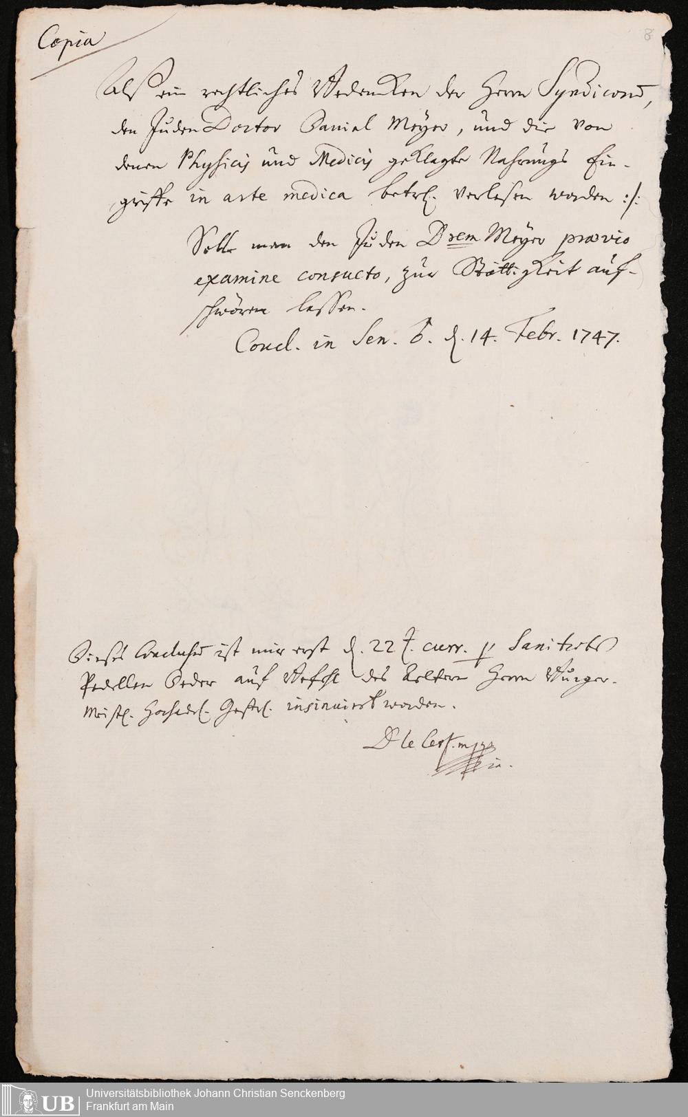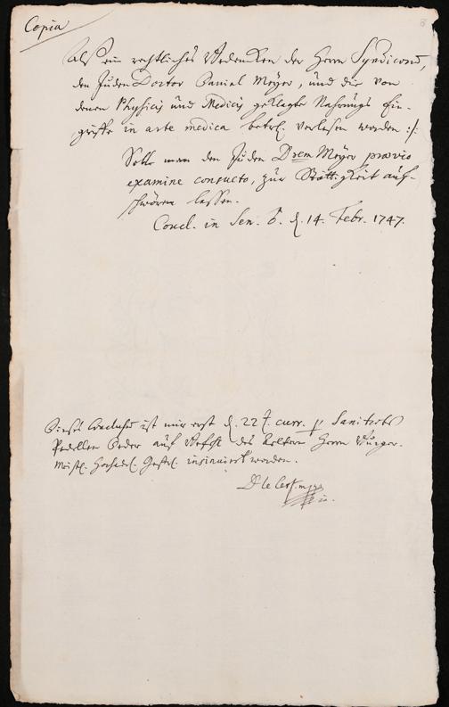 Na 31 Nachlass Johann Christian Senckenberg, 302 - Eingaben an den Senat und Beschlüsse über die Zulassung von Judenärzten in Frankfurt