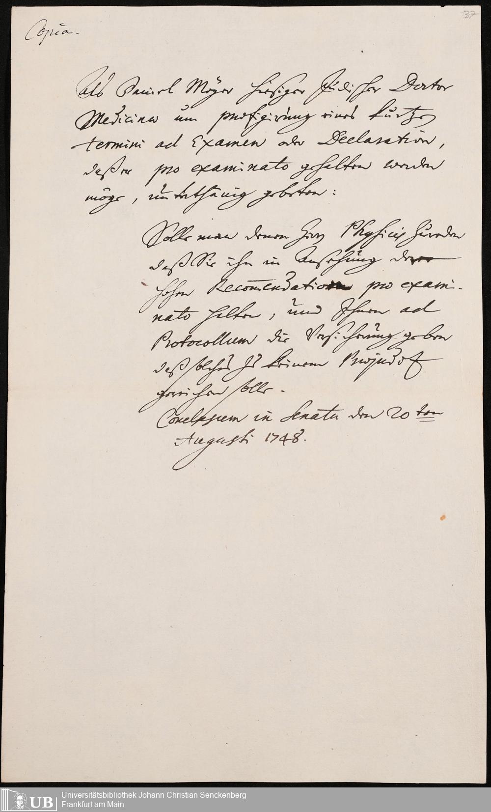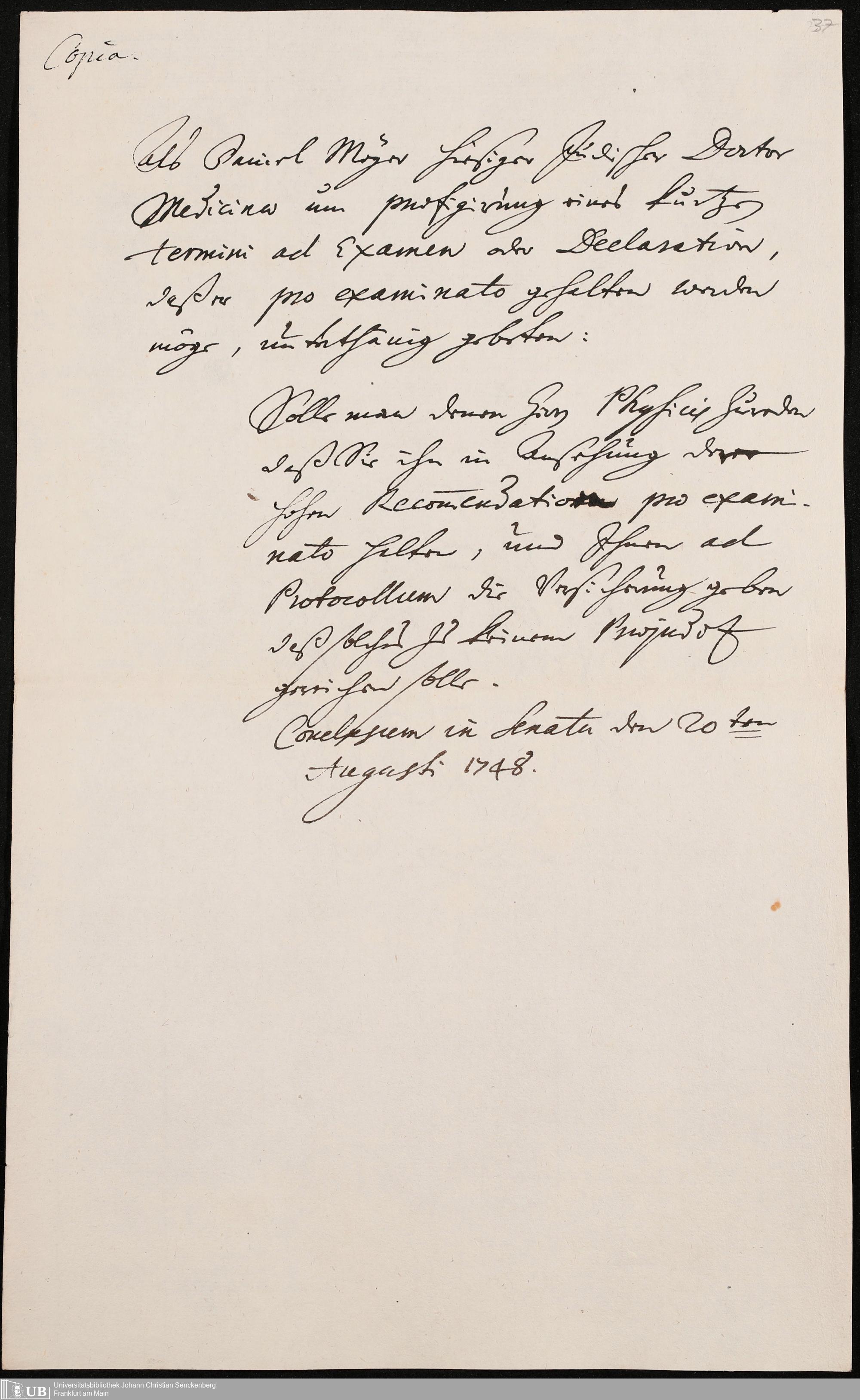 Na 31 Nachlass Johann Christian Senckenberg, 302 - Eingaben an den Senat und Beschlüsse über die Zulassung von Judenärzten in Frankfurt