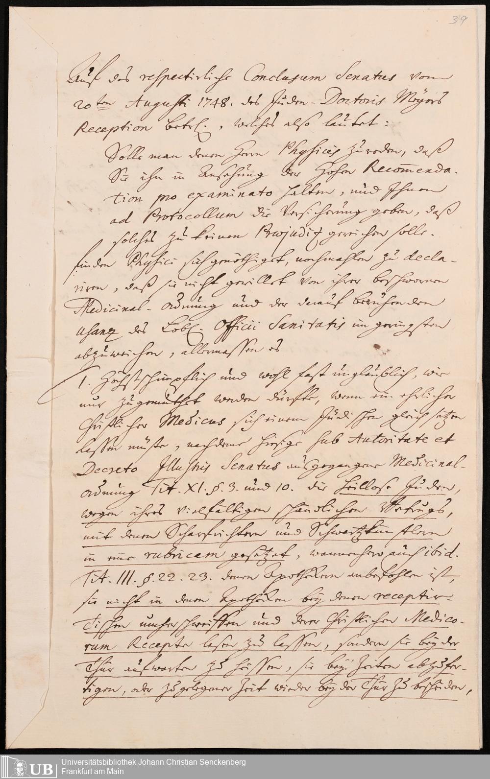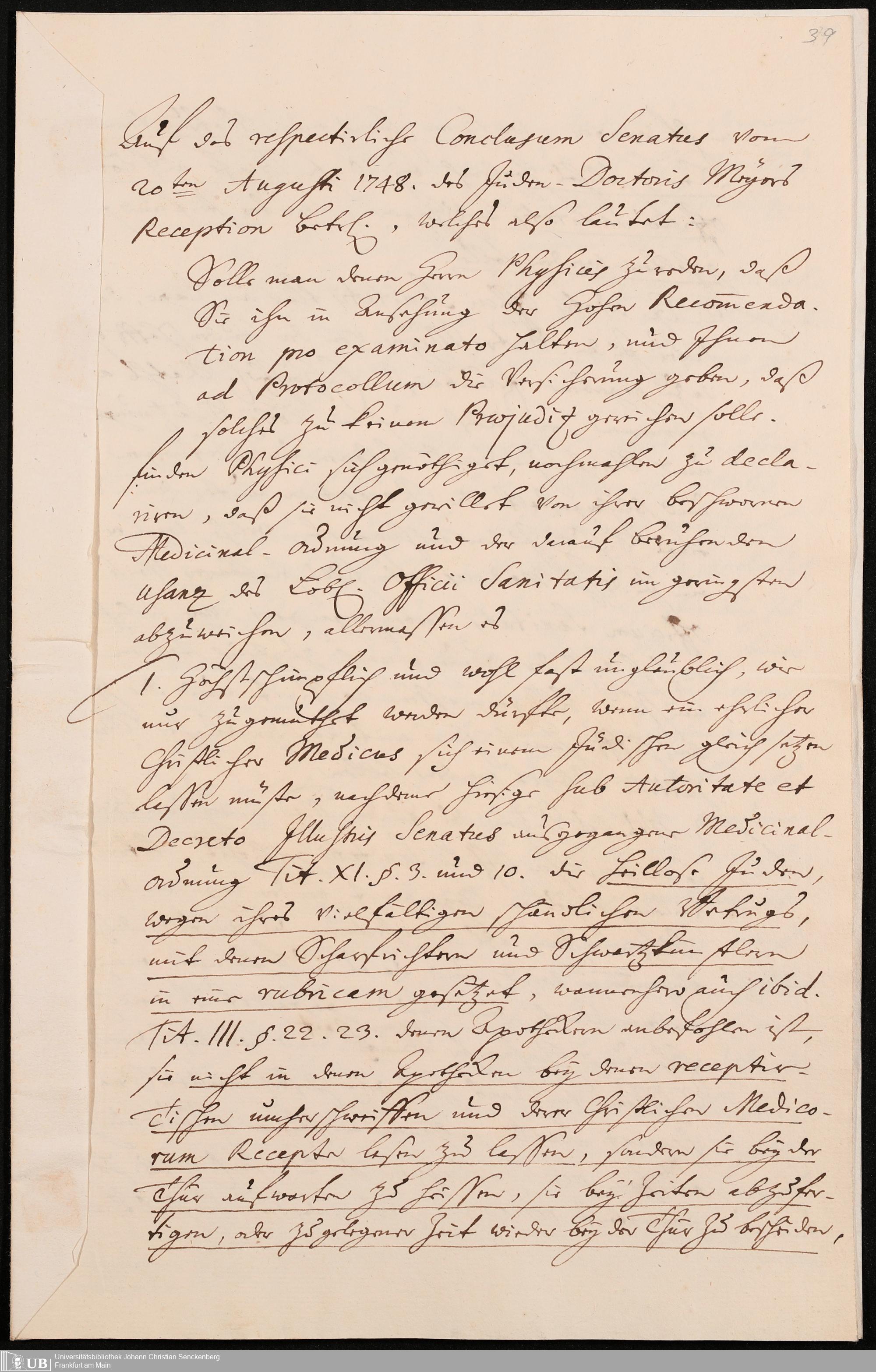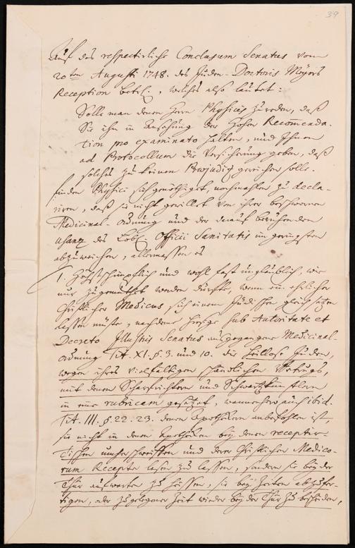 Na 31 Nachlass Johann Christian Senckenberg, 302 - Eingaben an den Senat und Beschlüsse über die Zulassung von Judenärzten in Frankfurt