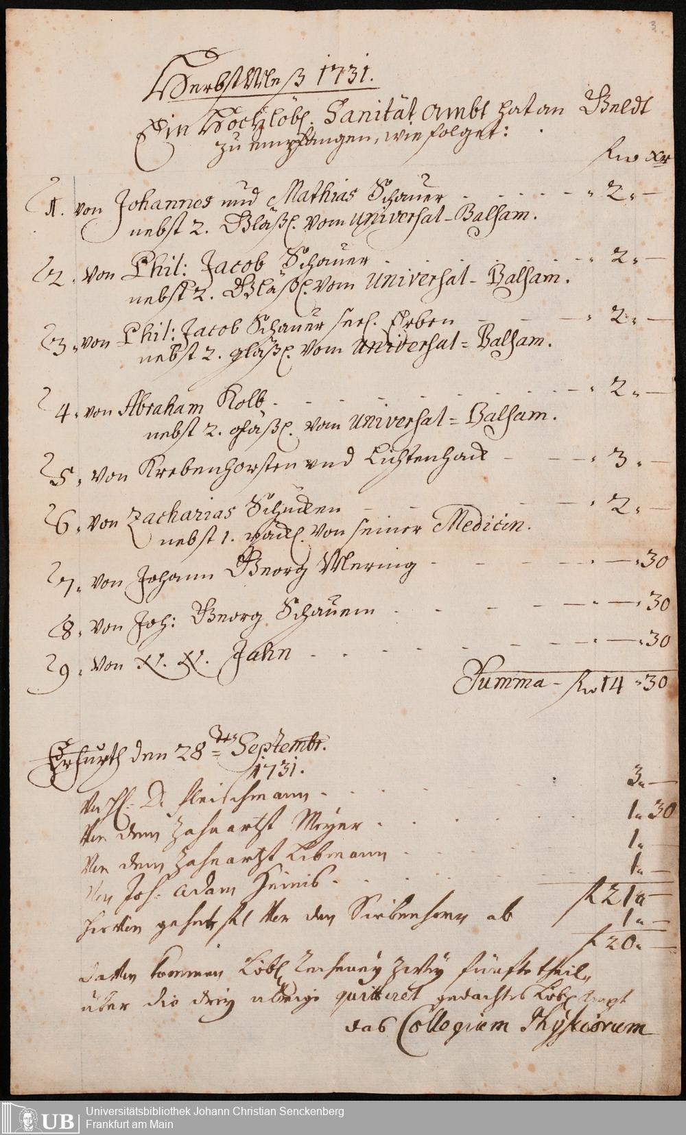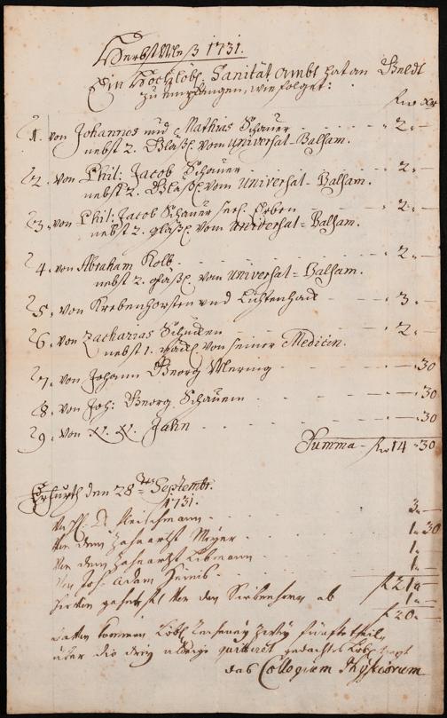 Na 31 Nachlass Johann Christian Senckenberg, 306 - Aufrechnungen der an das Sanitätsamt zu zahlenden Beträge von Händlern