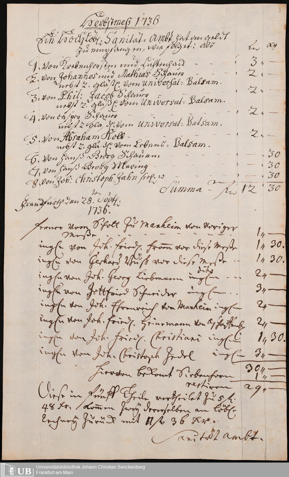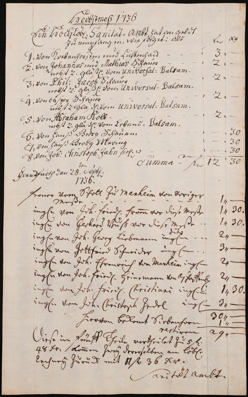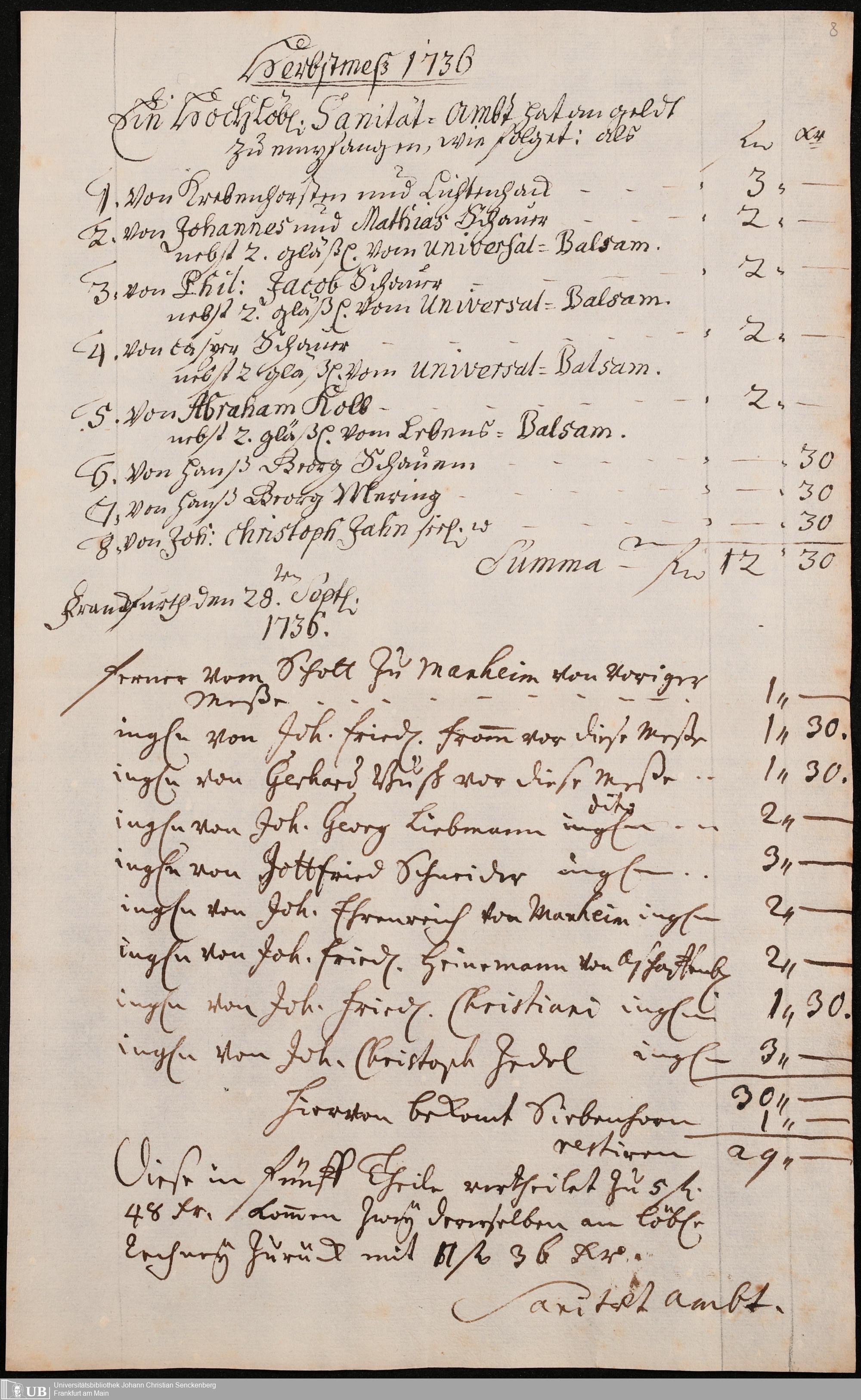 Na 31 Nachlass Johann Christian Senckenberg, 306 - Aufrechnungen der an das Sanitätsamt zu zahlenden Beträge von Händlern