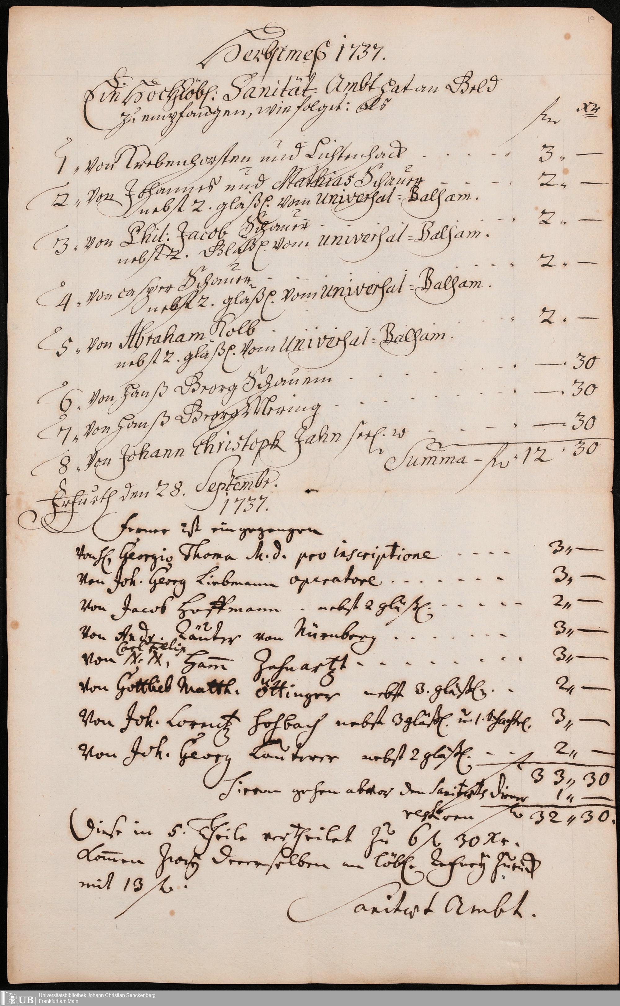 Na 31 Nachlass Johann Christian Senckenberg, 306 - Aufrechnungen der an das Sanitätsamt zu zahlenden Beträge von Händlern
