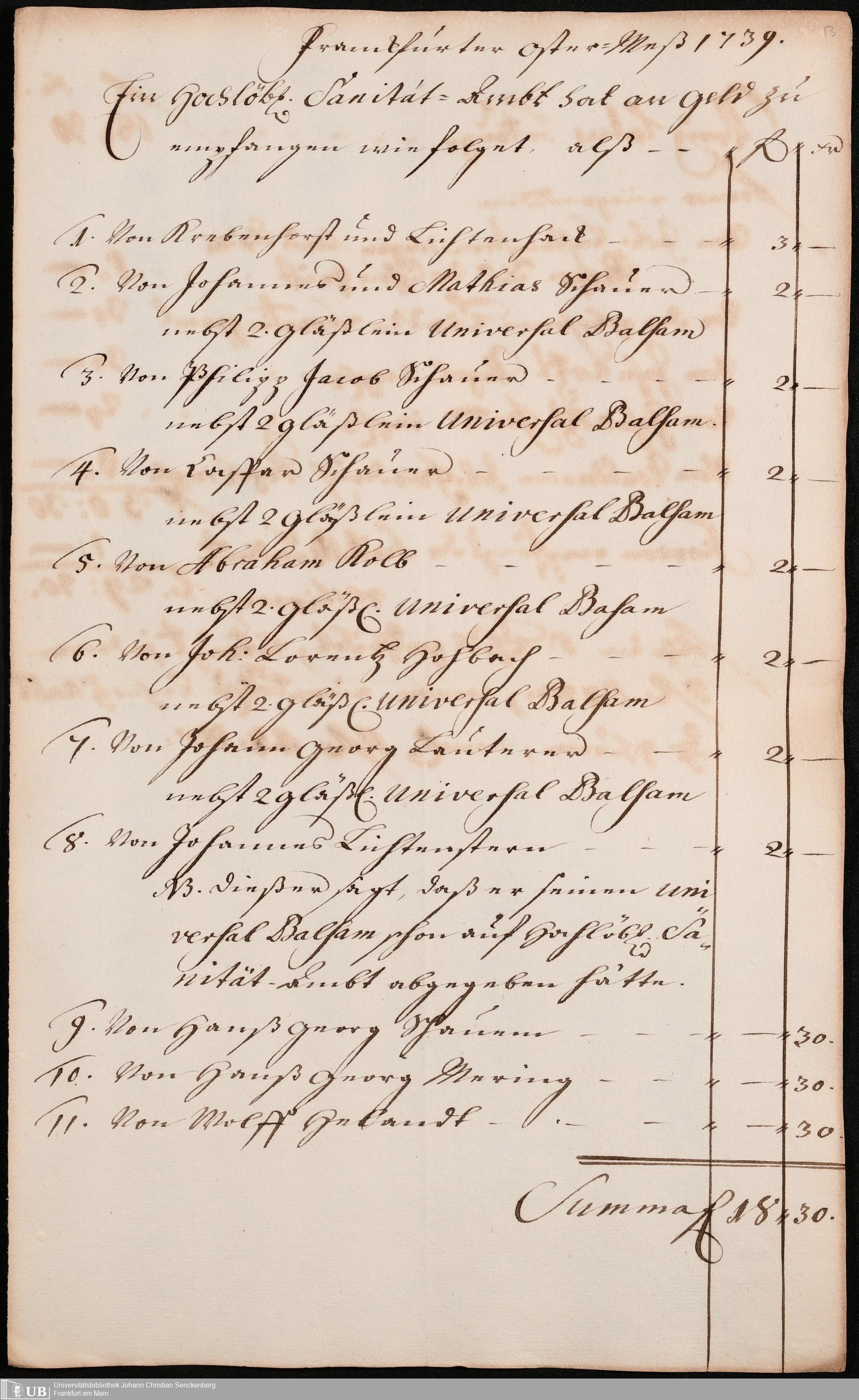 Na 31 Nachlass Johann Christian Senckenberg, 306 - Aufrechnungen der an das Sanitätsamt zu zahlenden Beträge von Händlern