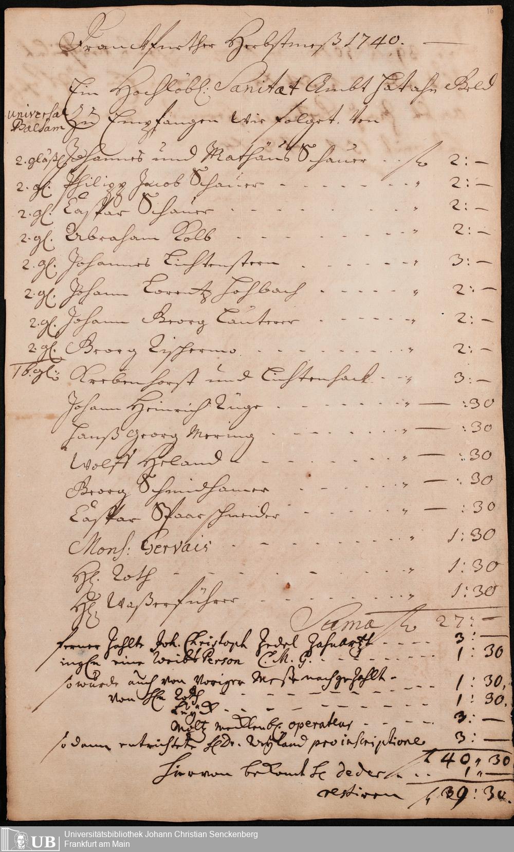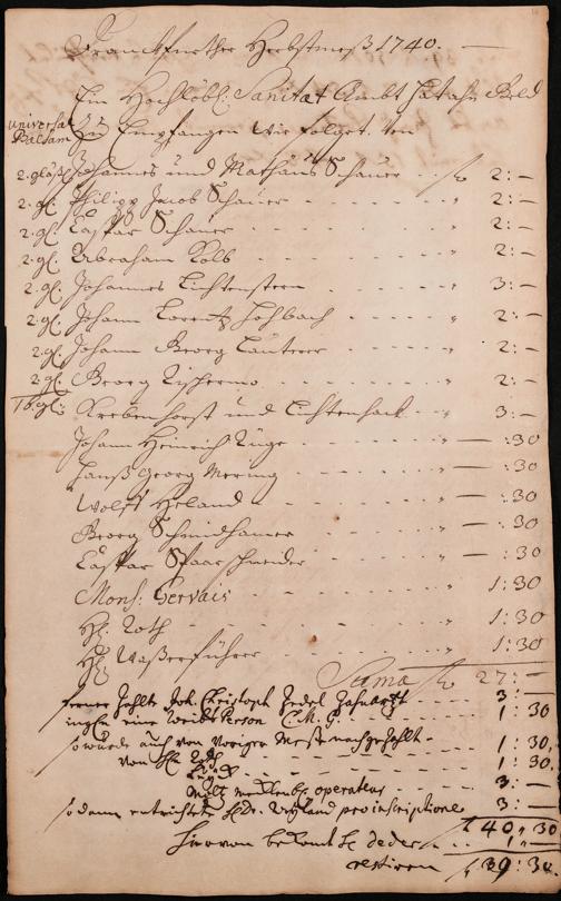 Na 31 Nachlass Johann Christian Senckenberg, 306 - Aufrechnungen der an das Sanitätsamt zu zahlenden Beträge von Händlern