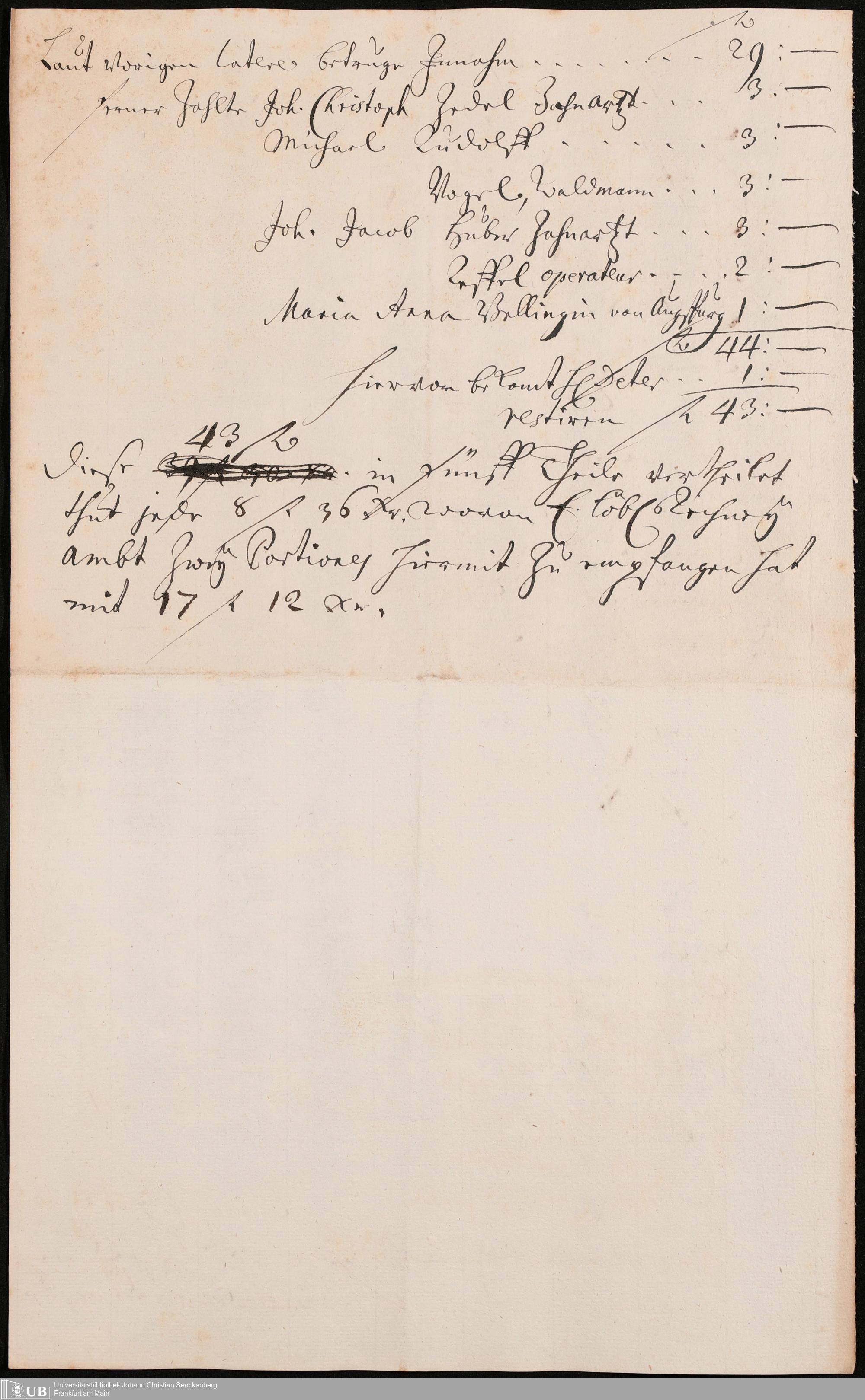 Na 31 Nachlass Johann Christian Senckenberg, 306 - Aufrechnungen der an das Sanitätsamt zu zahlenden Beträge von Händlern