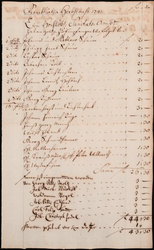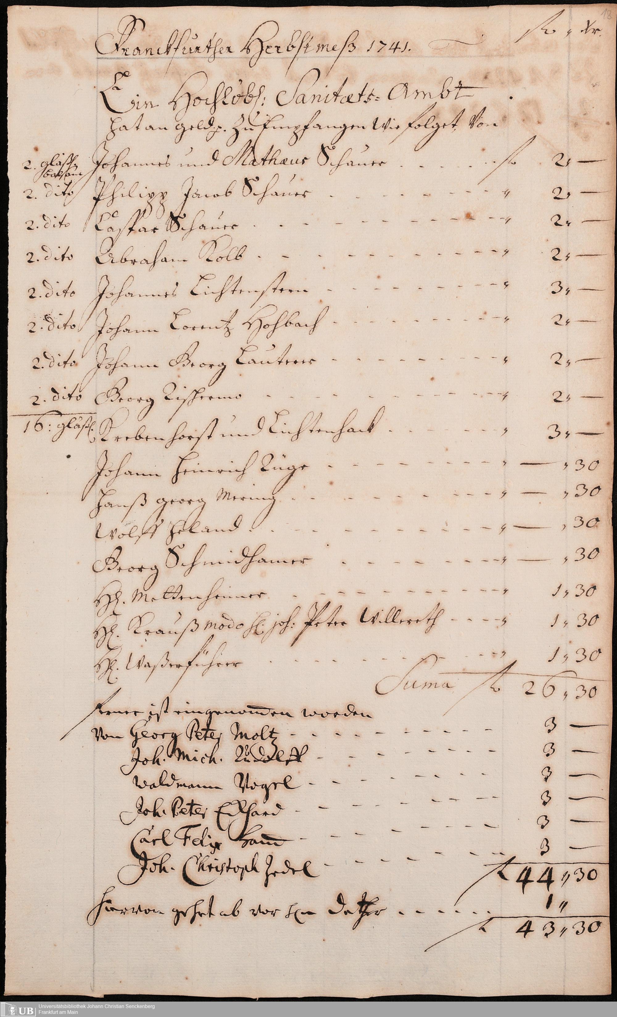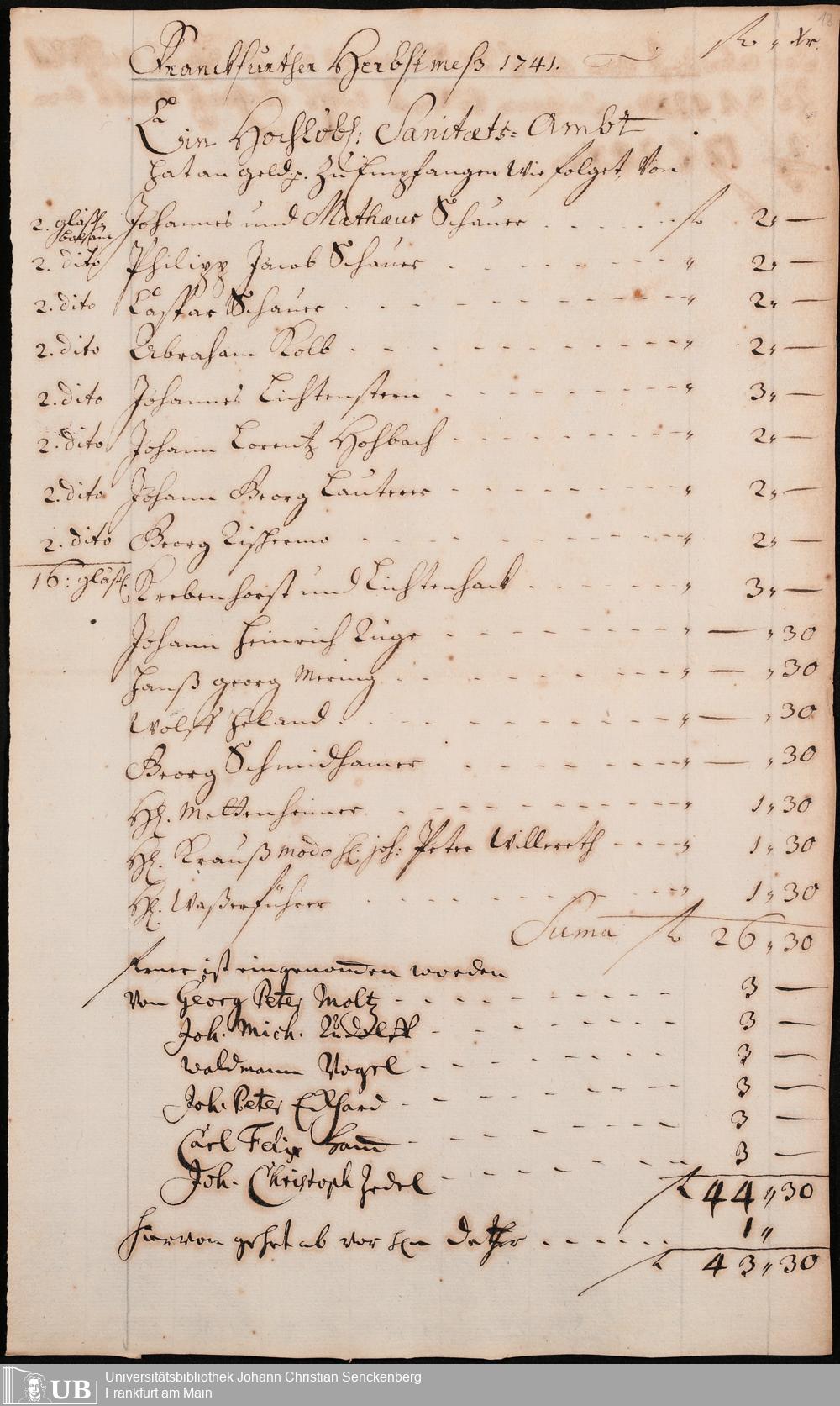 Na 31 Nachlass Johann Christian Senckenberg, 306 - Aufrechnungen der an das Sanitätsamt zu zahlenden Beträge von Händlern