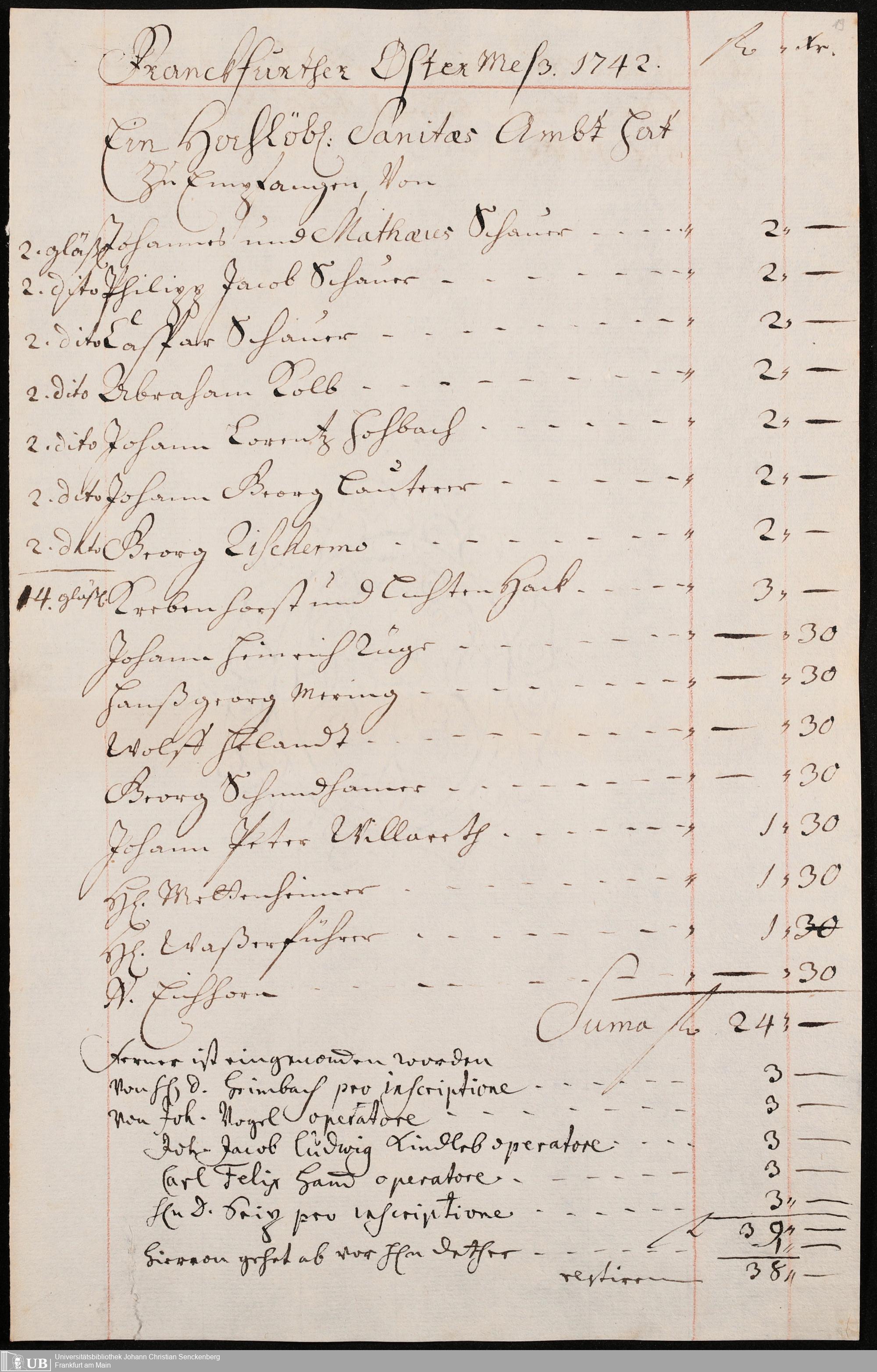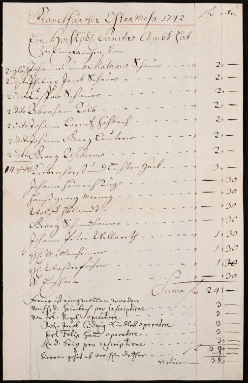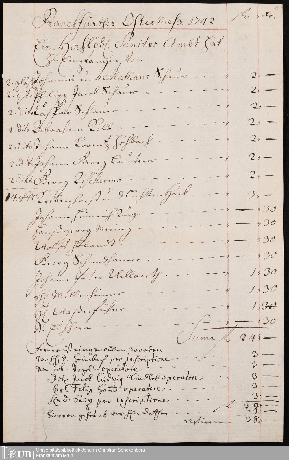 Na 31 Nachlass Johann Christian Senckenberg, 306 - Aufrechnungen der an das Sanitätsamt zu zahlenden Beträge von Händlern