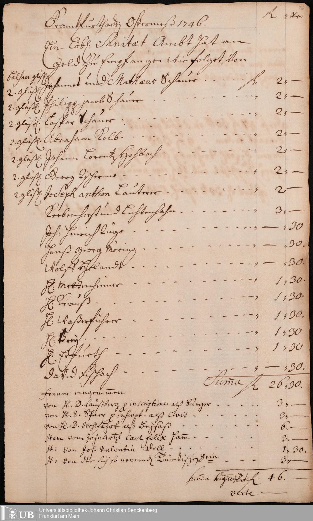 Na 31 Nachlass Johann Christian Senckenberg, 306 - Aufrechnungen der an das Sanitätsamt zu zahlenden Beträge von Händlern