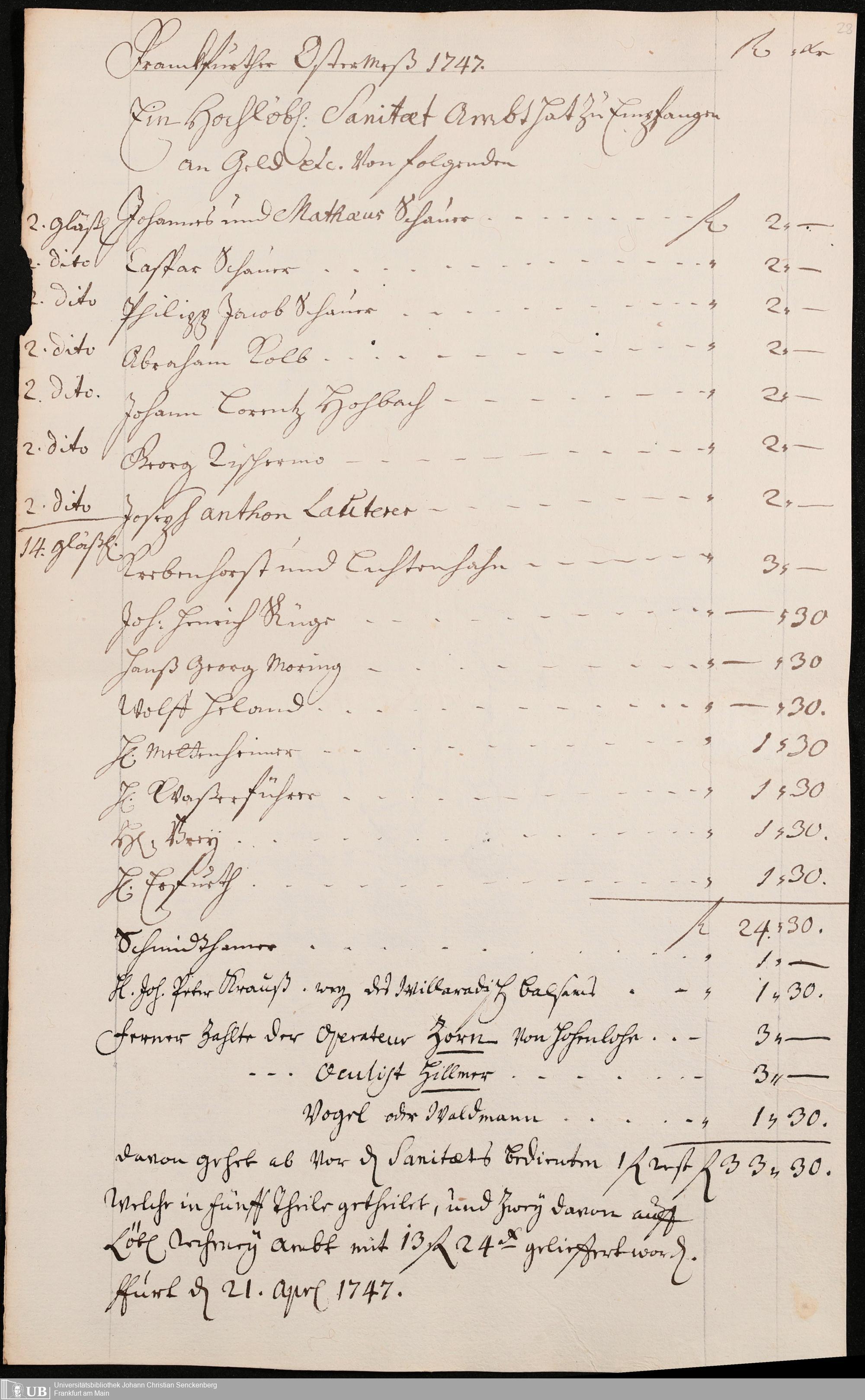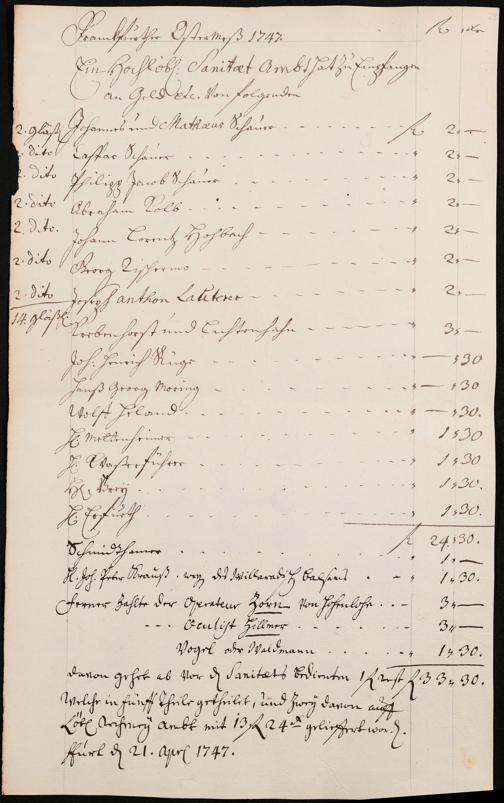 Na 31 Nachlass Johann Christian Senckenberg, 306 - Aufrechnungen der an das Sanitätsamt zu zahlenden Beträge von Händlern