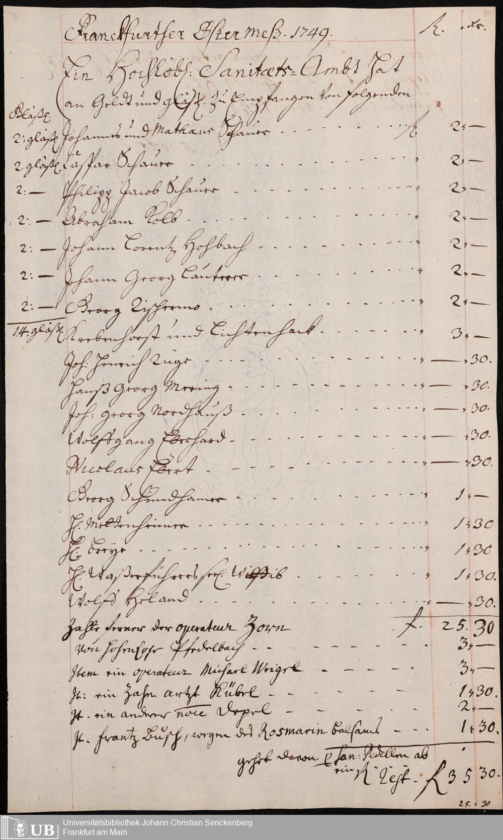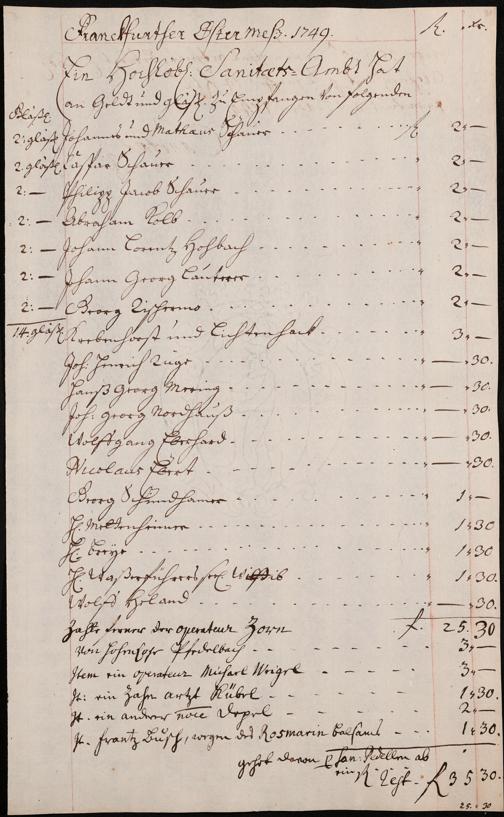 Na 31 Nachlass Johann Christian Senckenberg, 306 - Aufrechnungen der an das Sanitätsamt zu zahlenden Beträge von Händlern