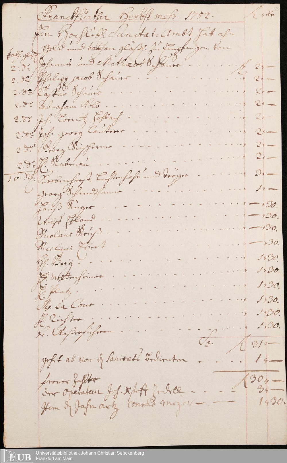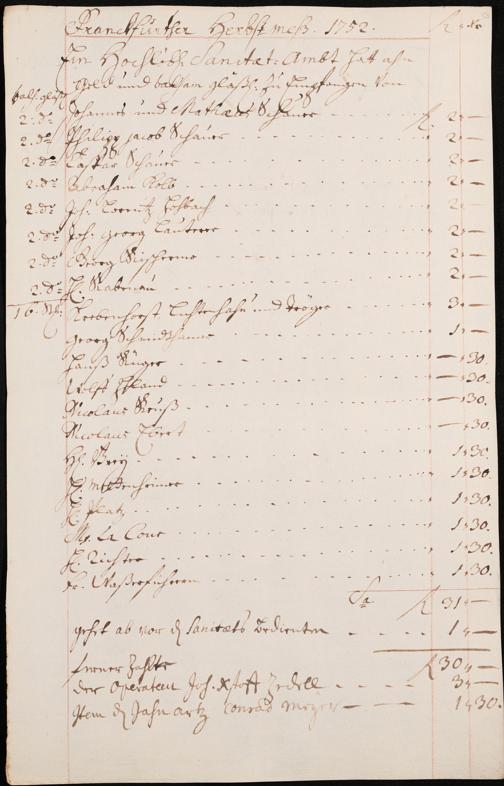 Na 31 Nachlass Johann Christian Senckenberg, 306 - Aufrechnungen der an das Sanitätsamt zu zahlenden Beträge von Händlern