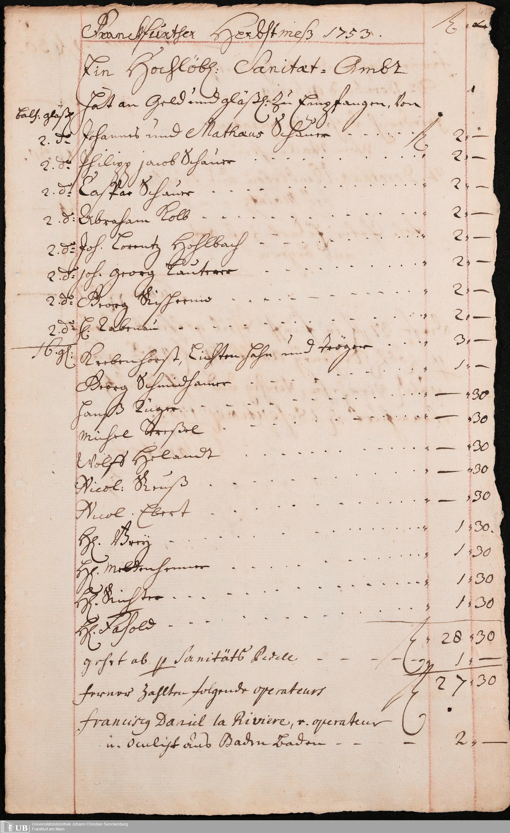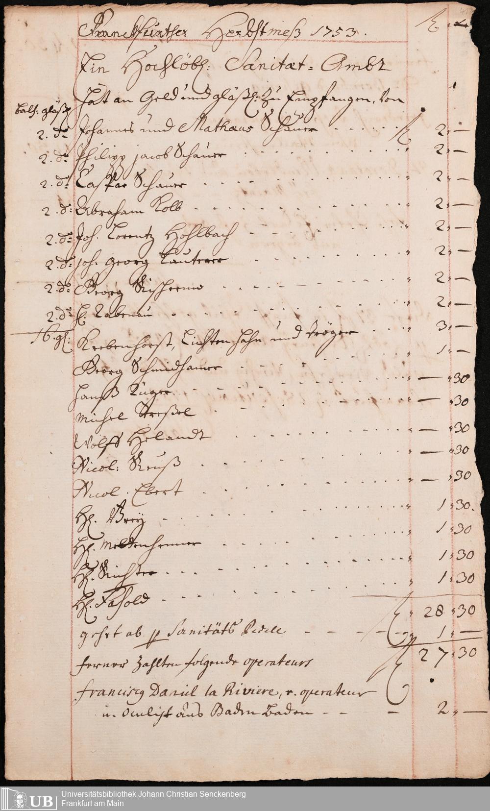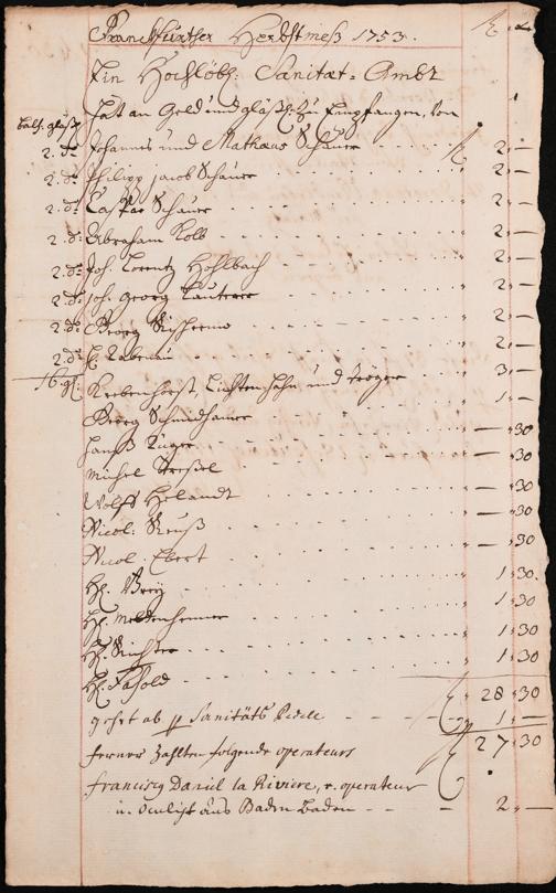 Na 31 Nachlass Johann Christian Senckenberg, 306 - Aufrechnungen der an das Sanitätsamt zu zahlenden Beträge von Händlern
