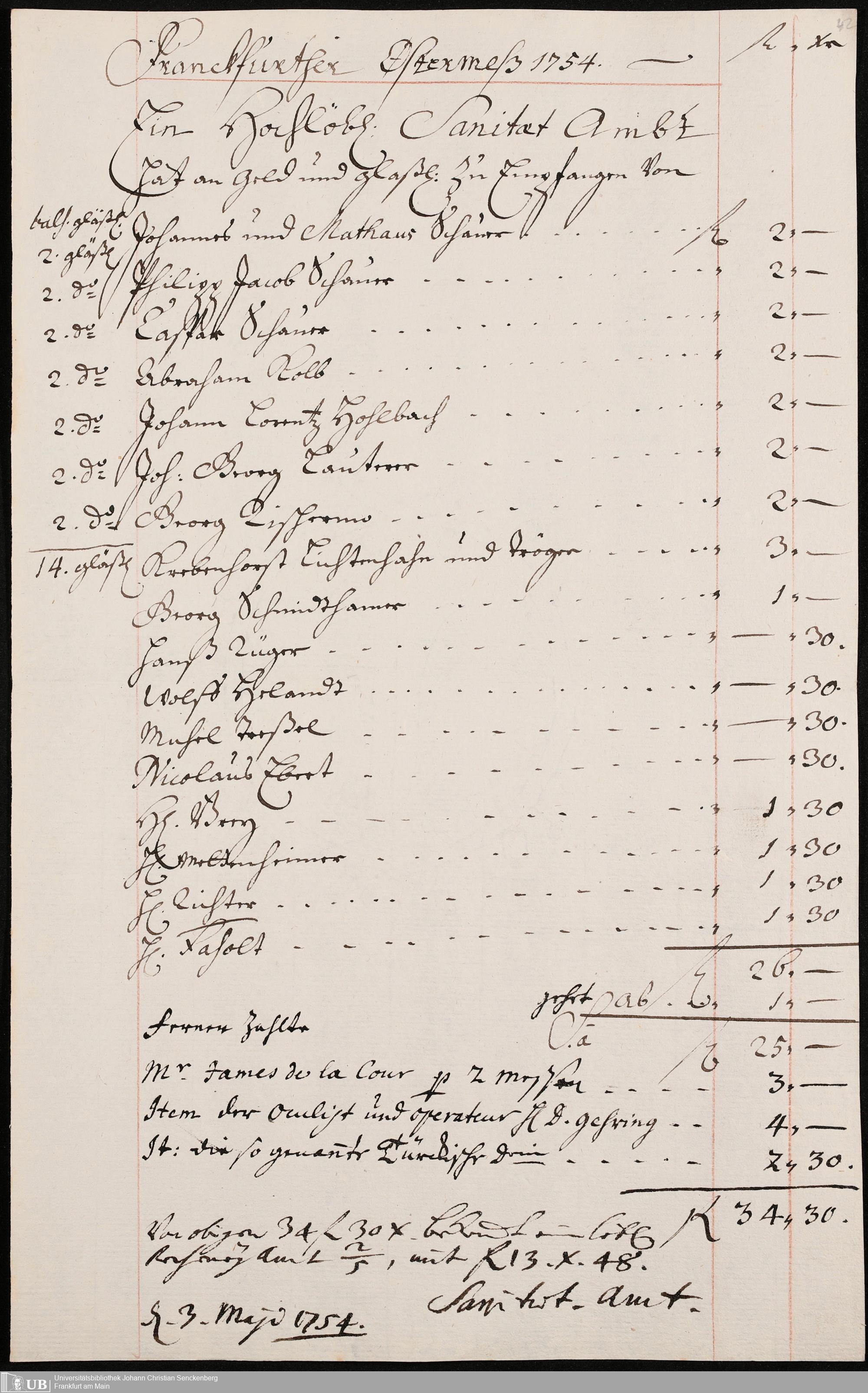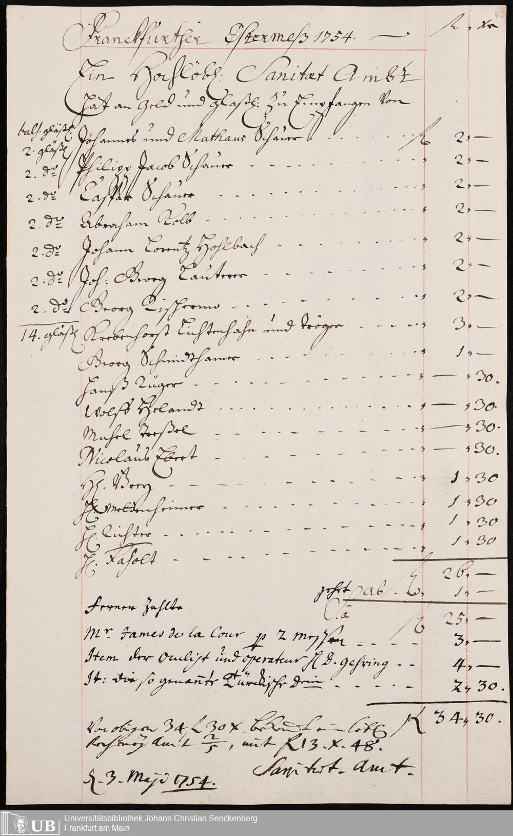 Na 31 Nachlass Johann Christian Senckenberg, 306 - Aufrechnungen der an das Sanitätsamt zu zahlenden Beträge von Händlern