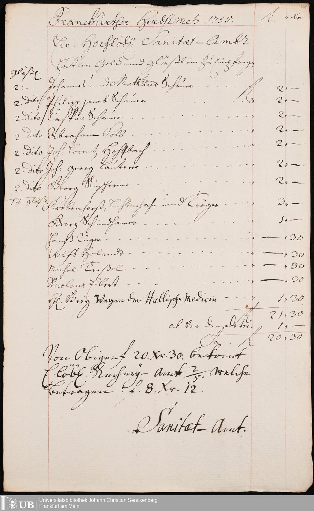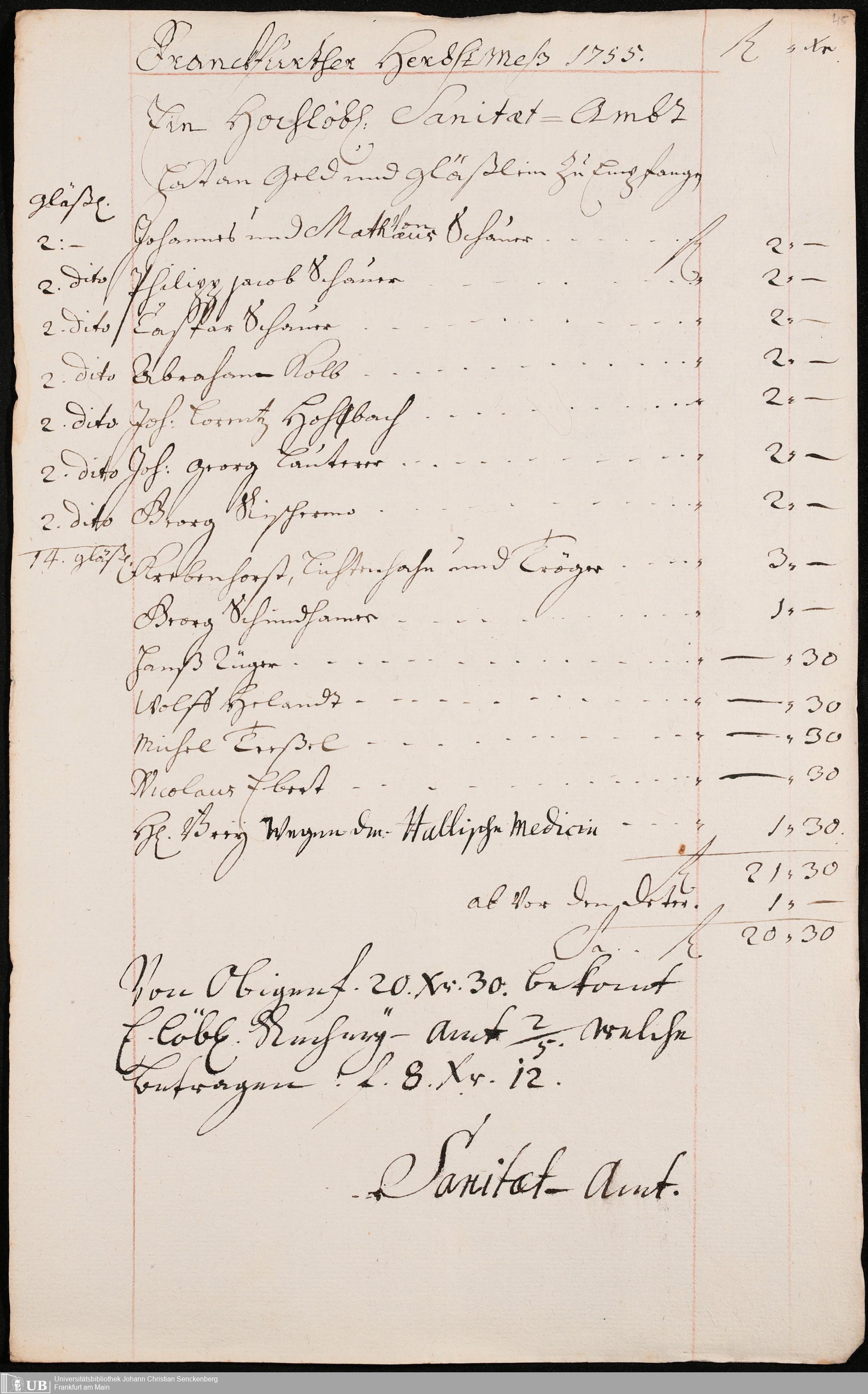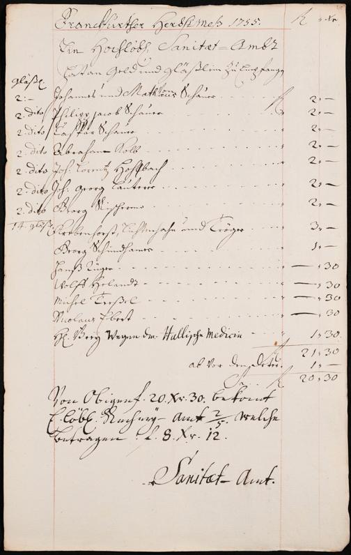 Na 31 Nachlass Johann Christian Senckenberg, 306 - Aufrechnungen der an das Sanitätsamt zu zahlenden Beträge von Händlern