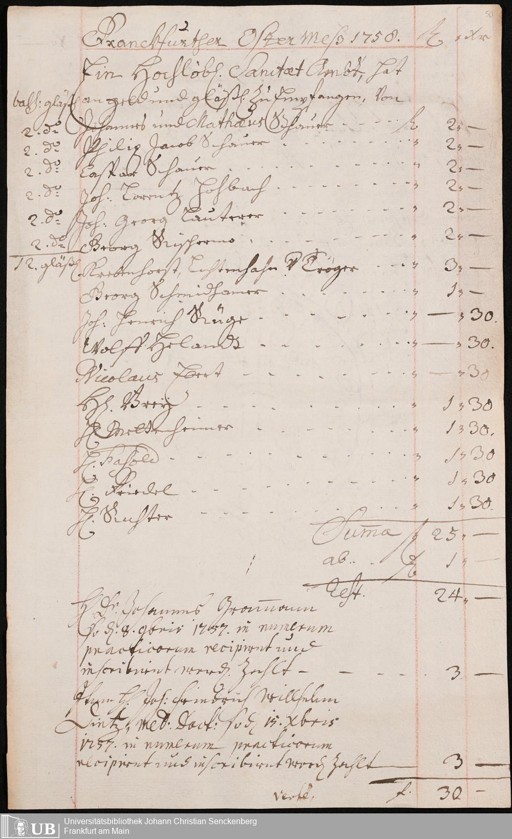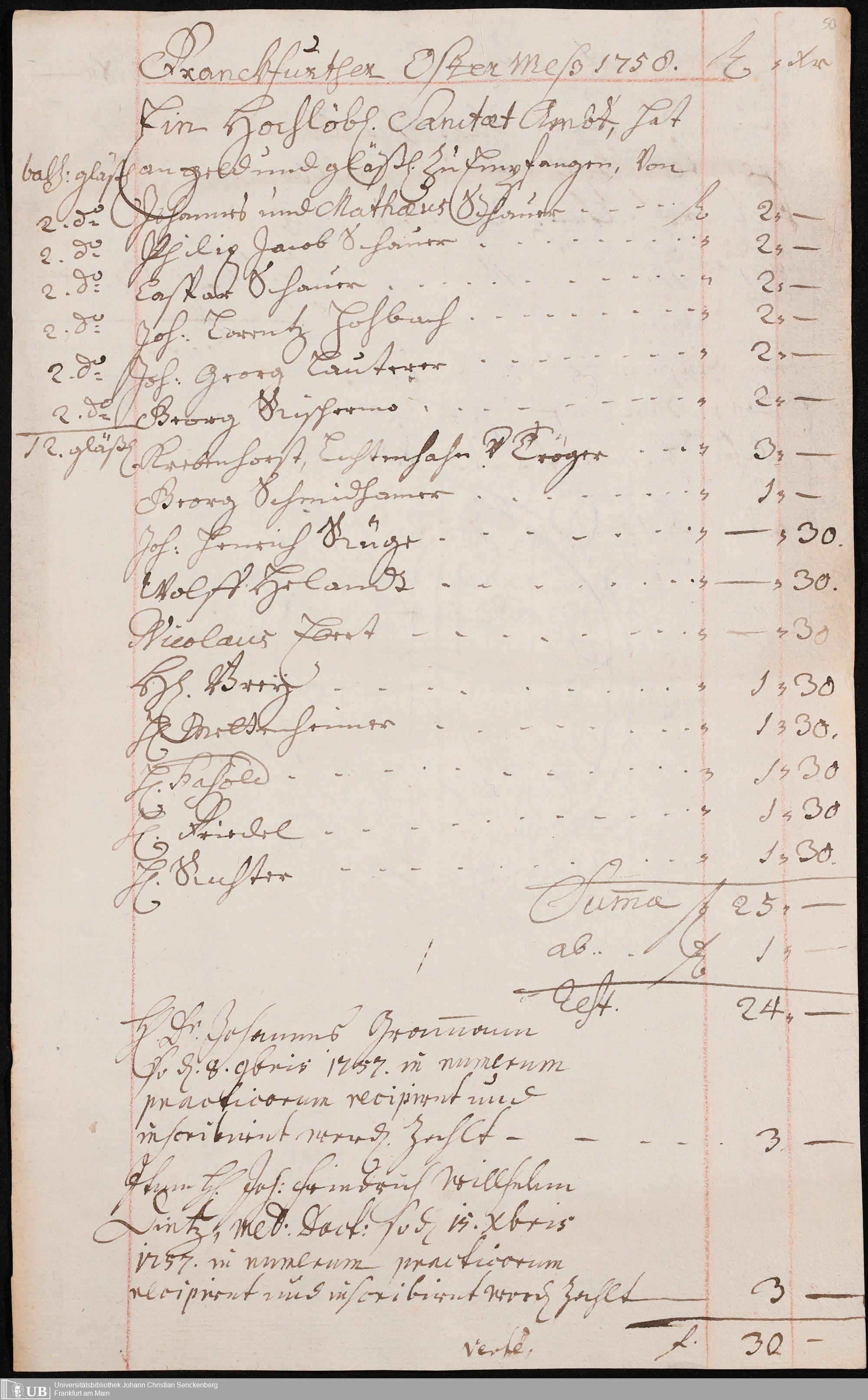 Na 31 Nachlass Johann Christian Senckenberg, 306 - Aufrechnungen der an das Sanitätsamt zu zahlenden Beträge von Händlern