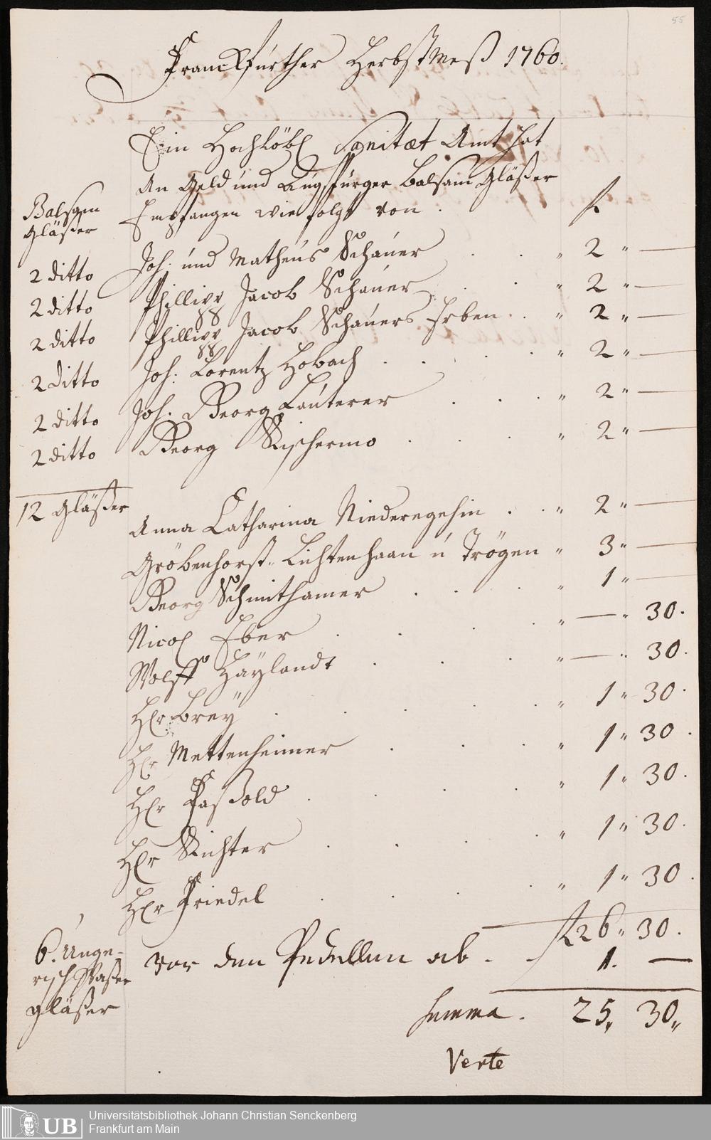 Na 31 Nachlass Johann Christian Senckenberg, 306 - Aufrechnungen der an das Sanitätsamt zu zahlenden Beträge von Händlern