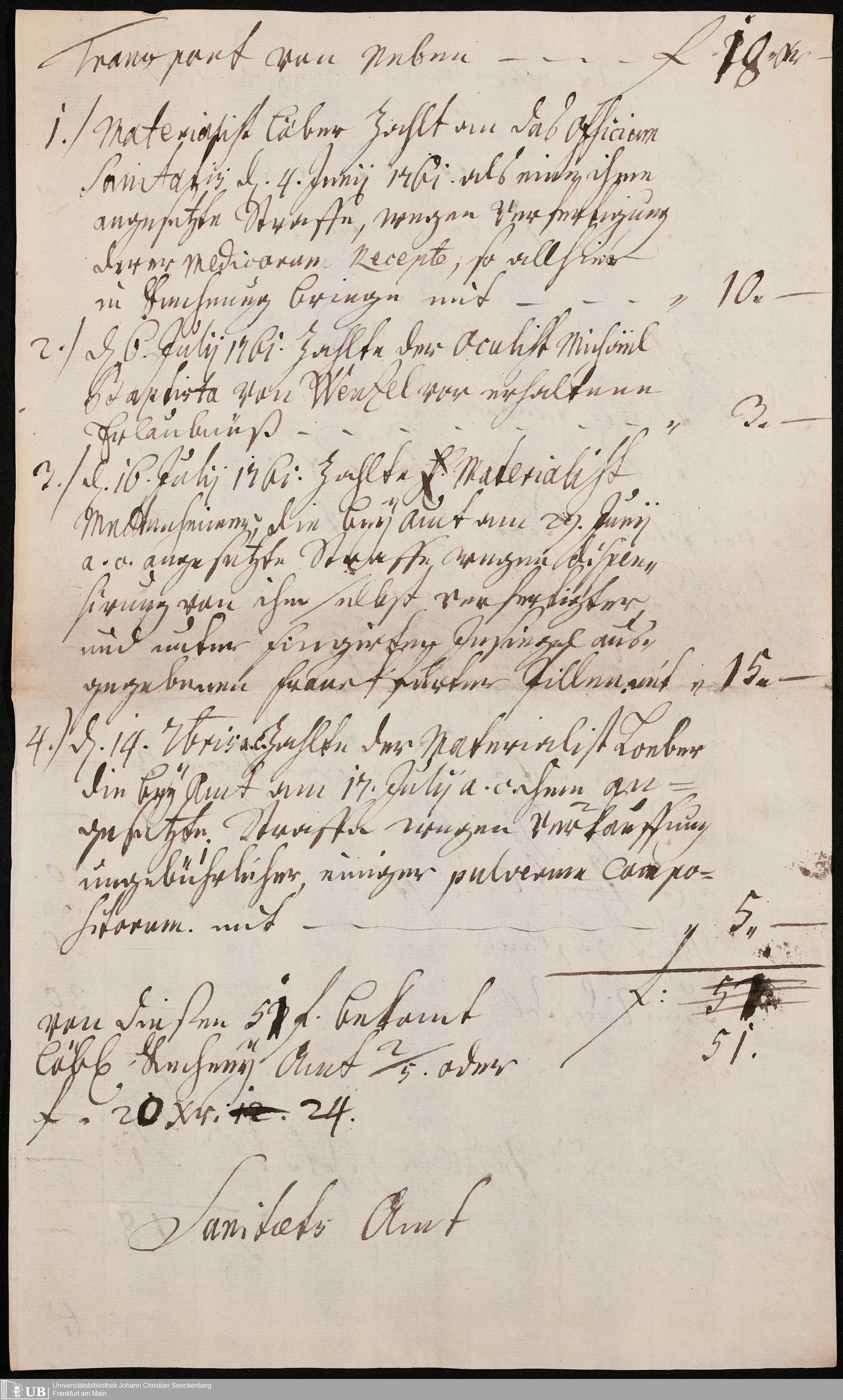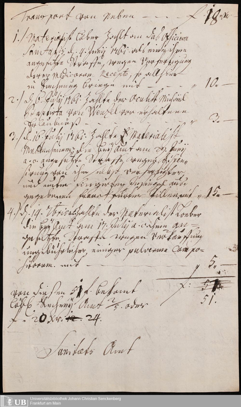 Na 31 Nachlass Johann Christian Senckenberg, 306 - Aufrechnungen der an das Sanitätsamt zu zahlenden Beträge von Händlern