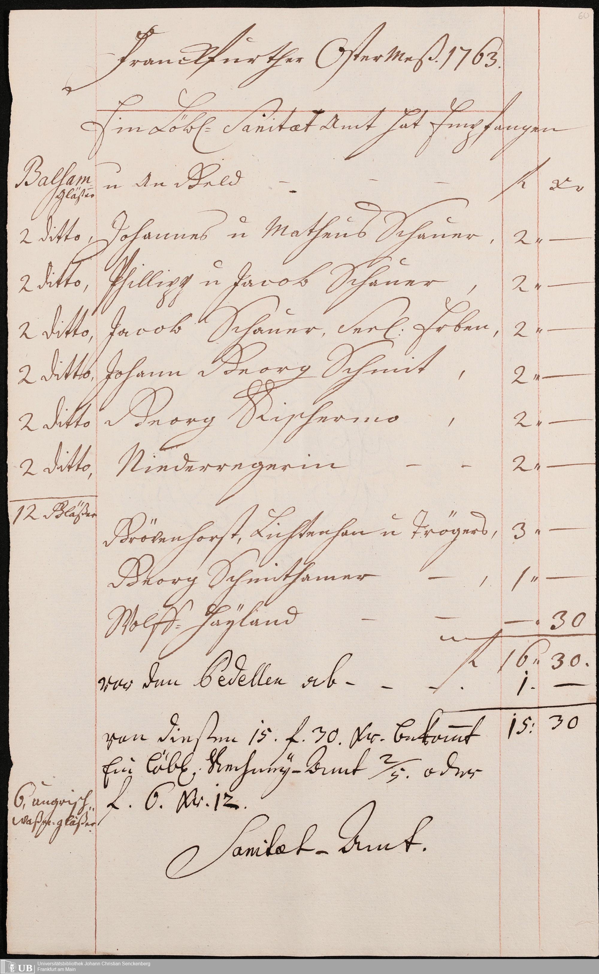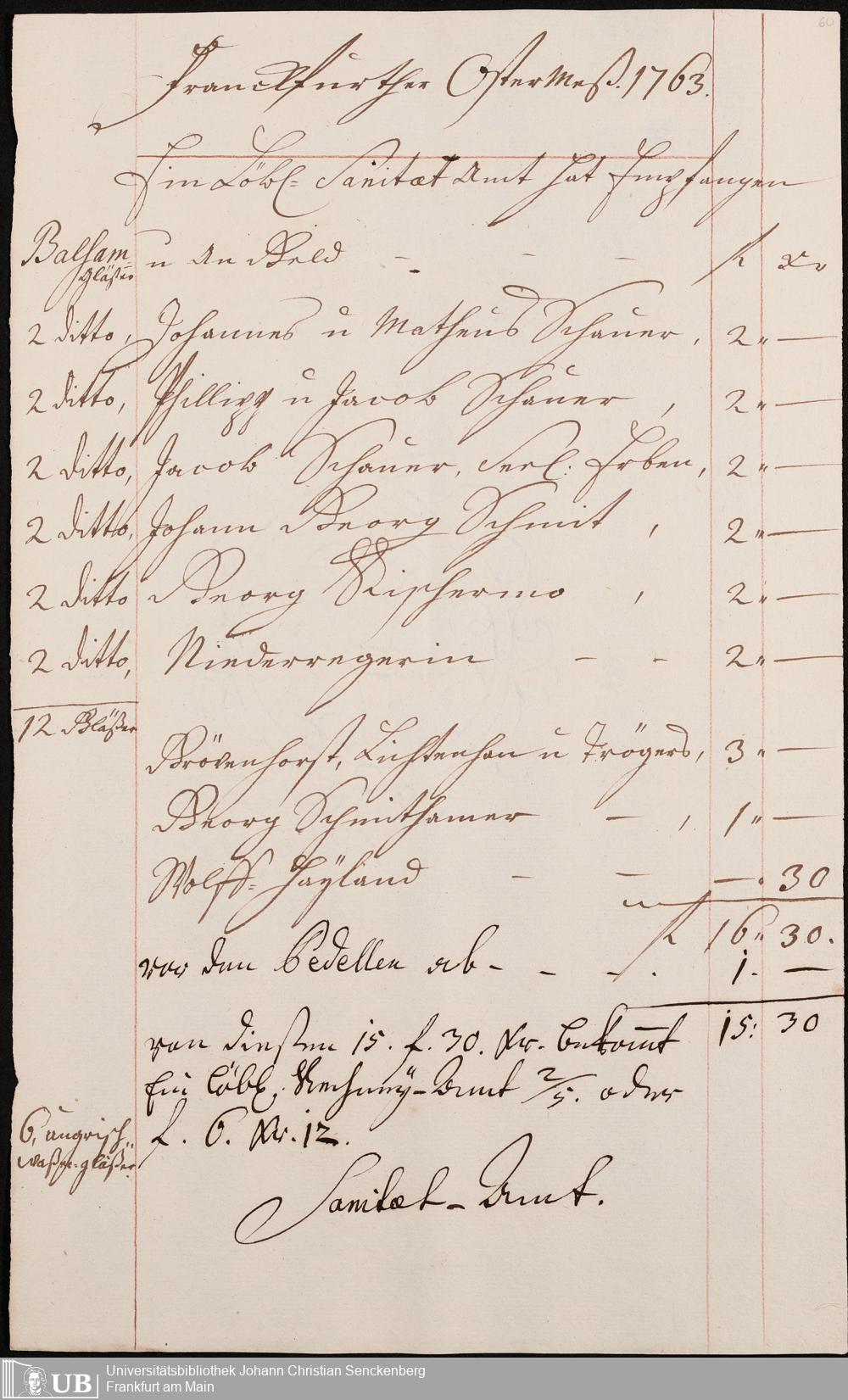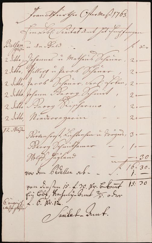 Na 31 Nachlass Johann Christian Senckenberg, 306 - Aufrechnungen der an das Sanitätsamt zu zahlenden Beträge von Händlern