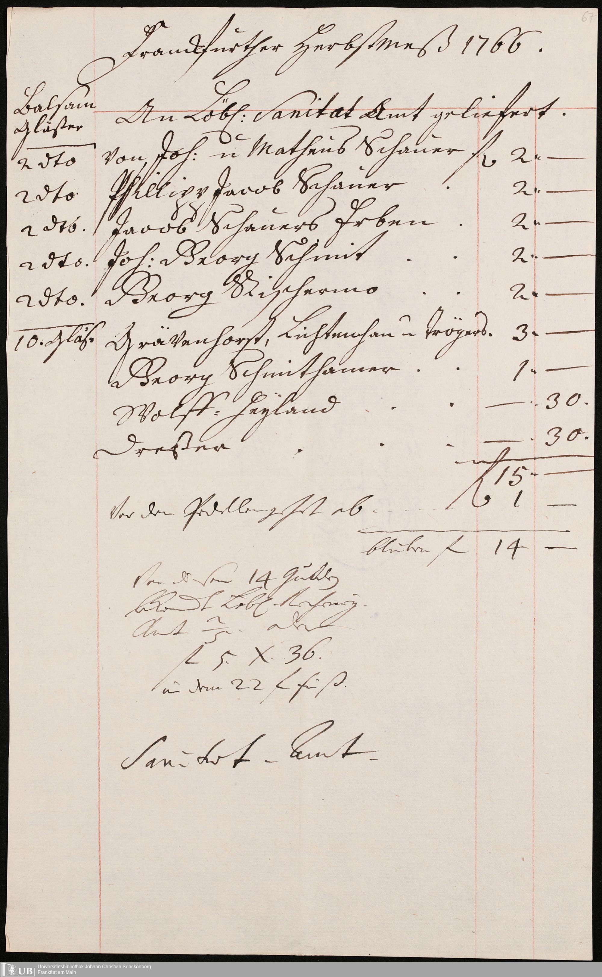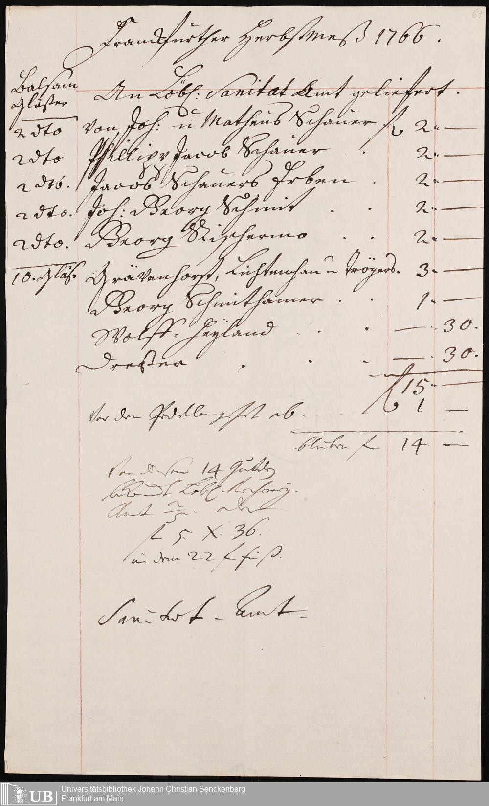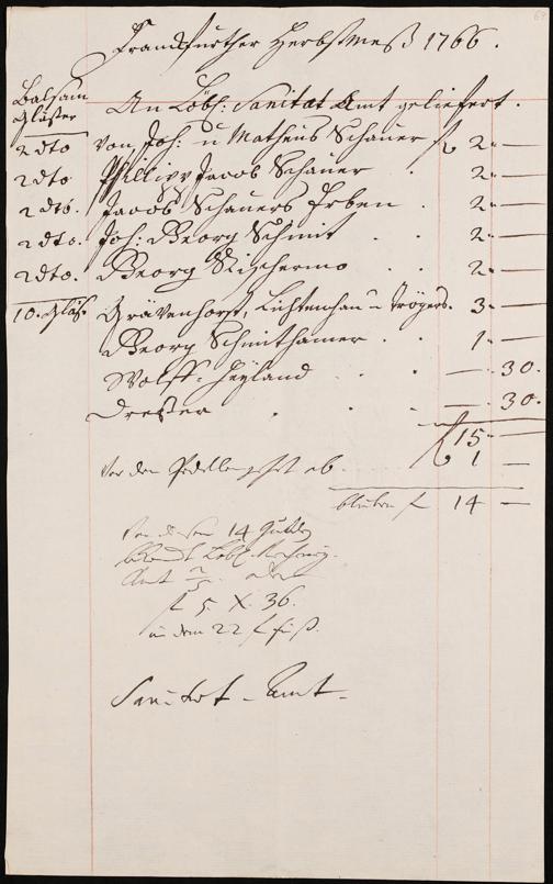 Na 31 Nachlass Johann Christian Senckenberg, 306 - Aufrechnungen der an das Sanitätsamt zu zahlenden Beträge von Händlern