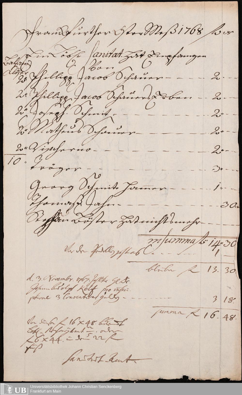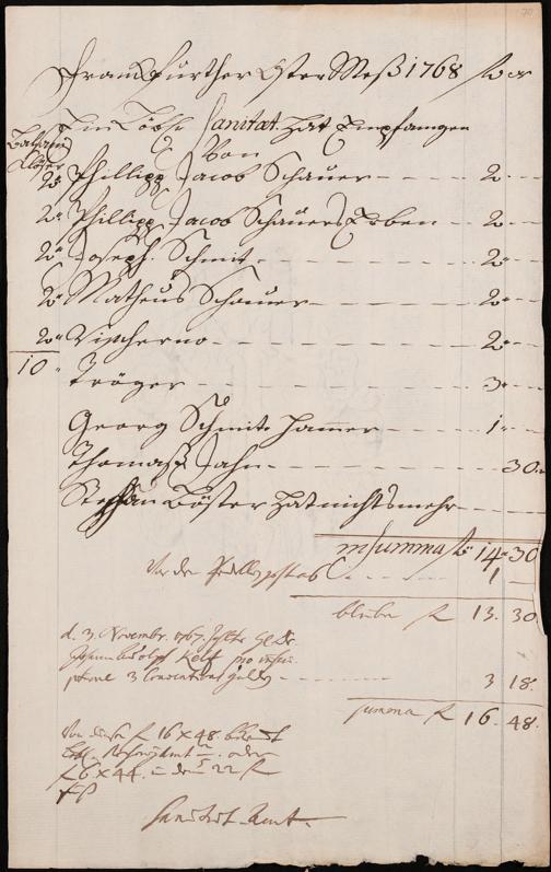 Na 31 Nachlass Johann Christian Senckenberg, 306 - Aufrechnungen der an das Sanitätsamt zu zahlenden Beträge von Händlern