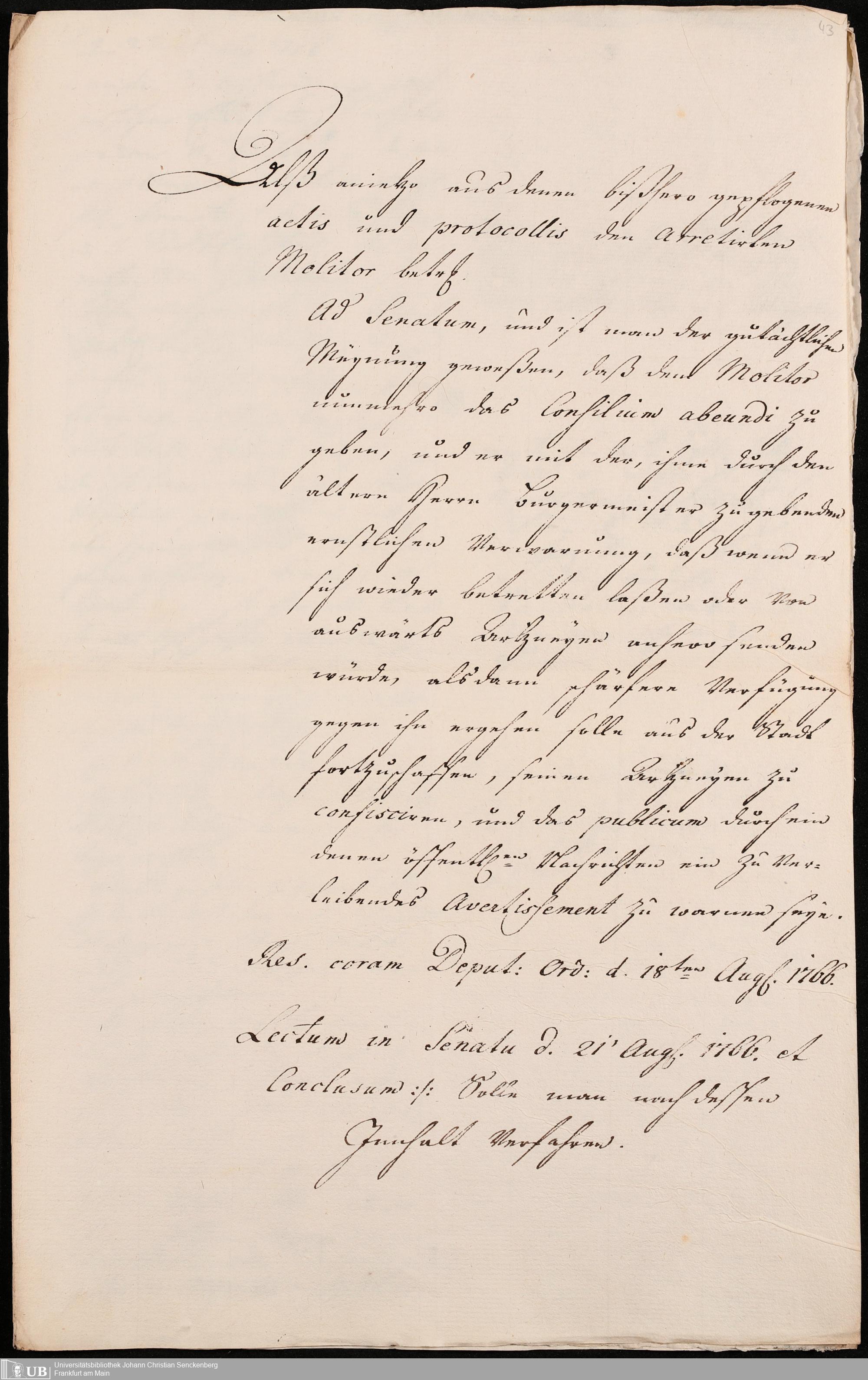 Na 31 Nachlass Johann Christian Senckenberg, 307 - Anzeigen Senckenbergs beim Senat gegen Molitor