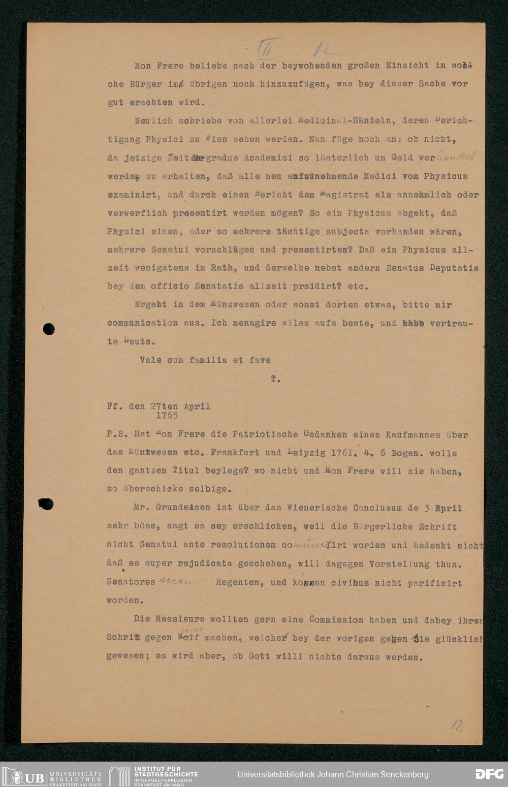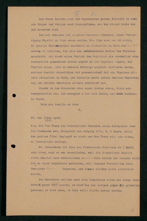 V48 Dr. Senckenbergische Stiftung, 202 - ... Transkriptionen der Briefe Johann Christian Senckenbergs an seinen Bruder Heinrich Christian von Senckenberg in Wien, Bd. 1