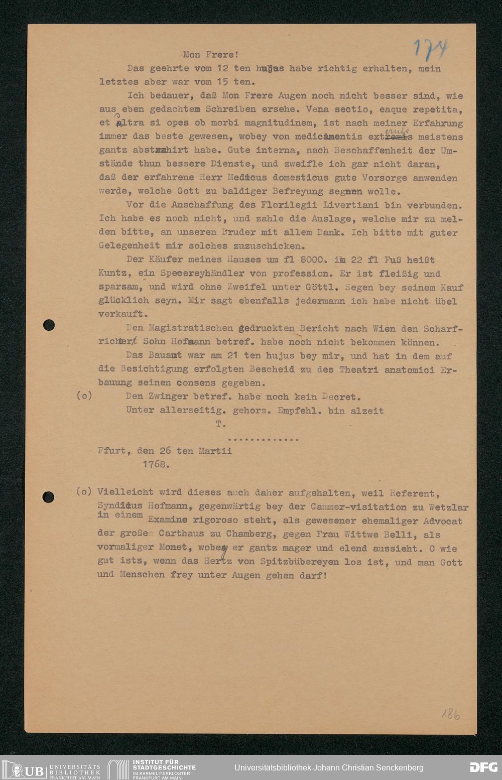 V48 Dr. Senckenbergische Stiftung, 202 - ... Transkriptionen der Briefe Johann Christian Senckenbergs an seinen Bruder Heinrich Christian von Senckenberg in Wien, Bd. 1