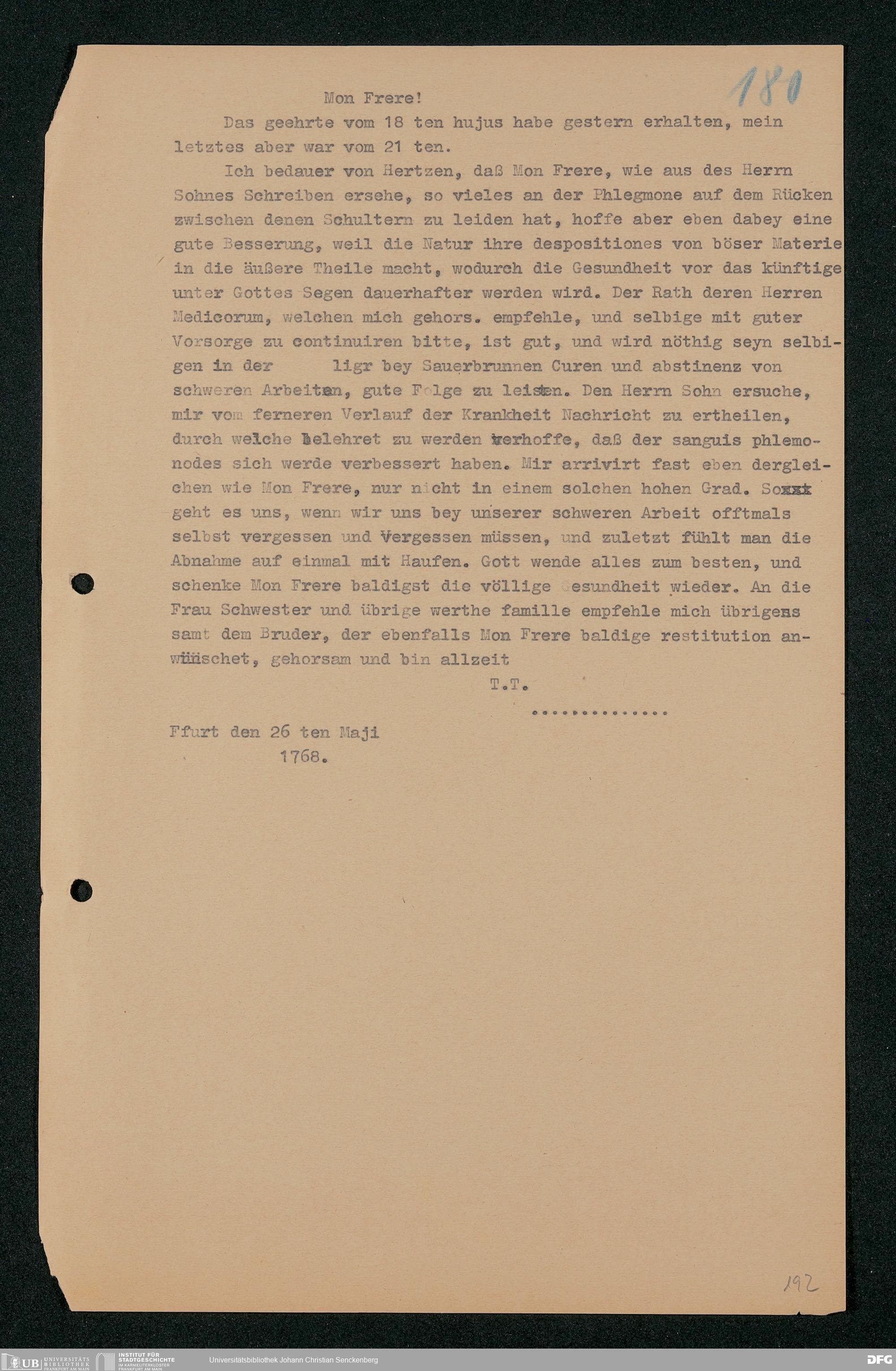 V48 Dr. Senckenbergische Stiftung, 202 - ... Transkriptionen der Briefe Johann Christian Senckenbergs an seinen Bruder Heinrich Christian von Senckenberg in Wien, Bd. 1
