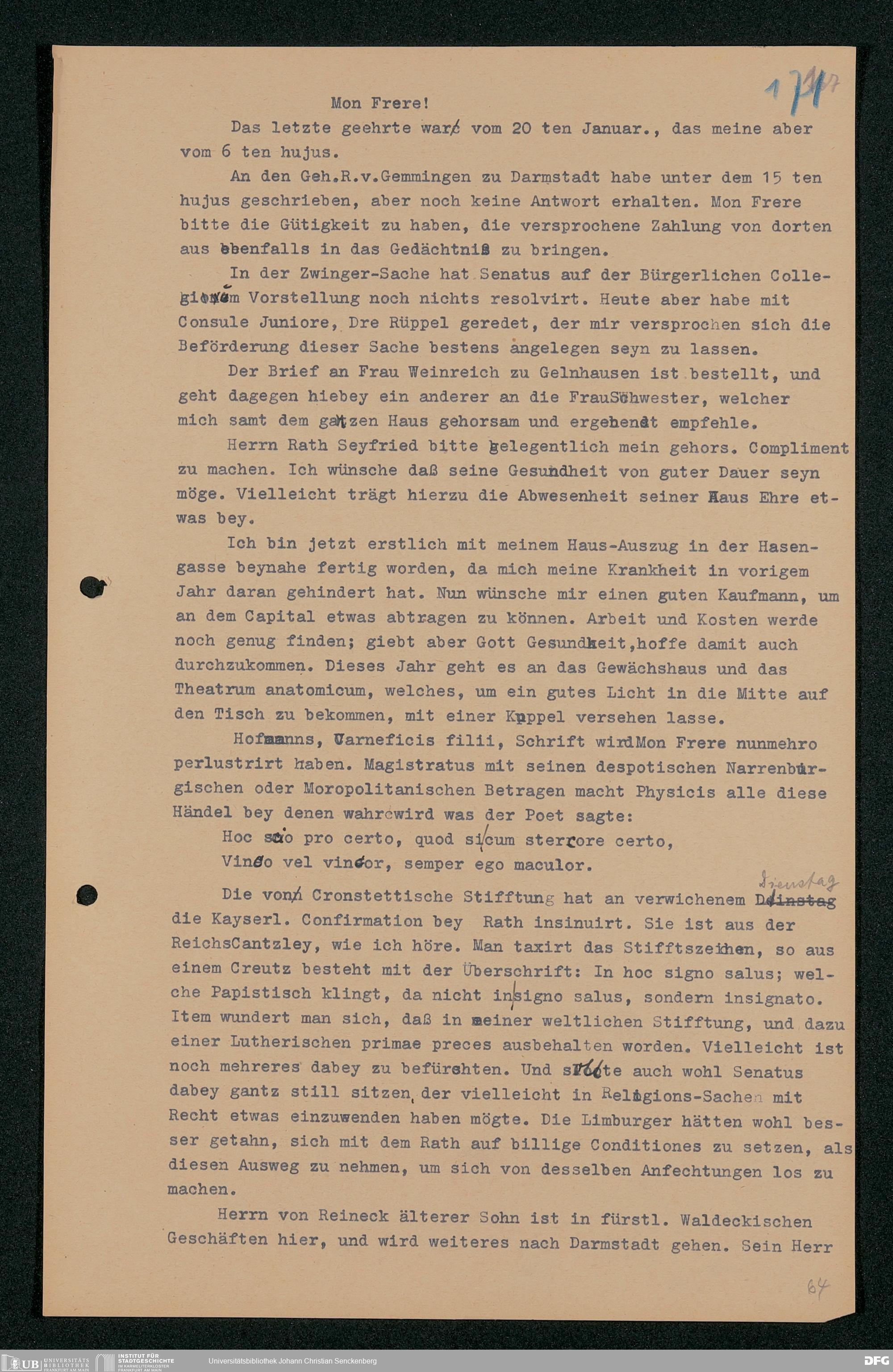 V48 Dr. Senckenbergische Stiftung, 203 - ... Transkriptionen der Briefe Johann Christian Senckenbergs an seinen Bruder Heinrich Christian von Senckenberg in Wien, Bd. 2