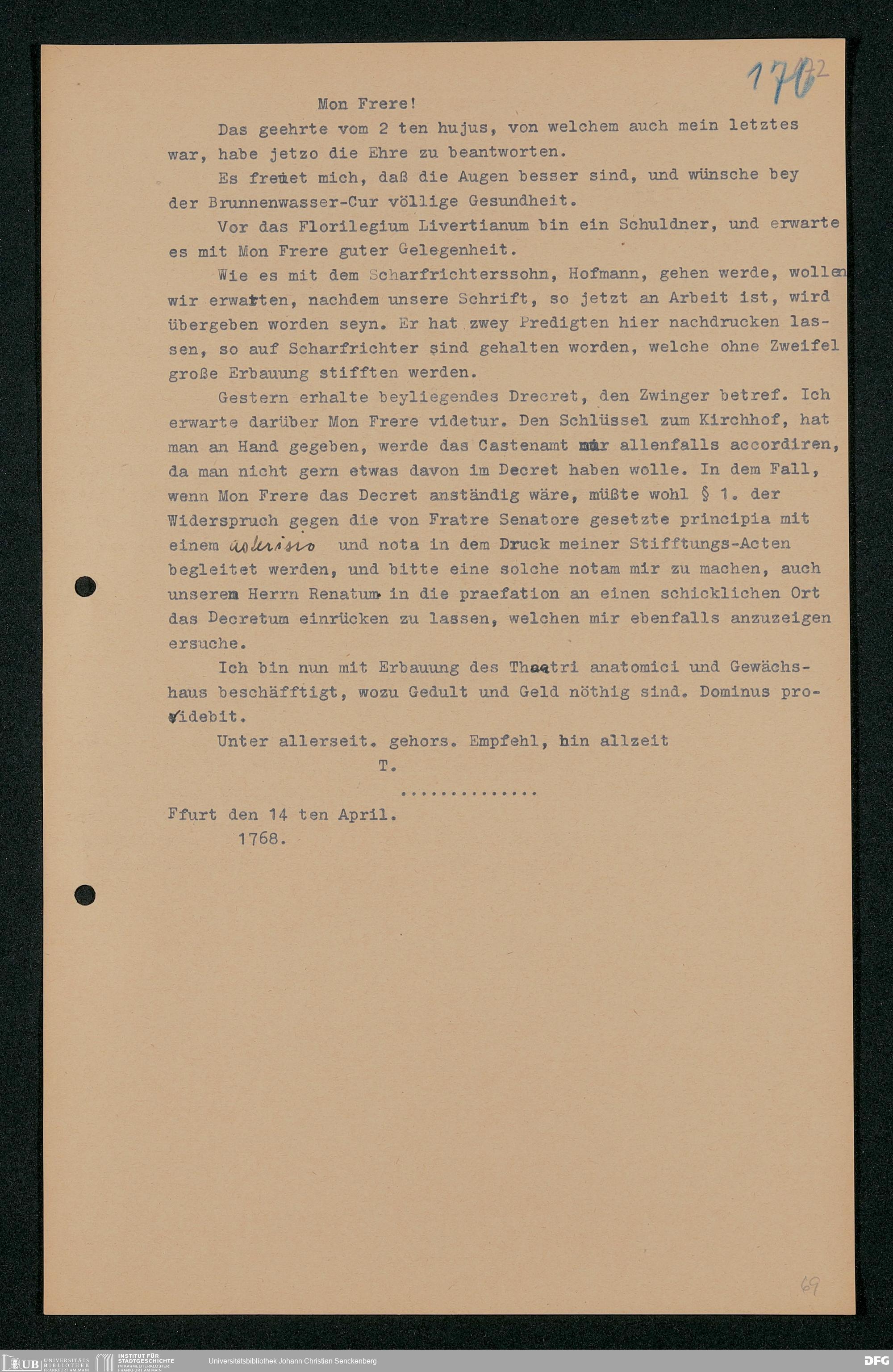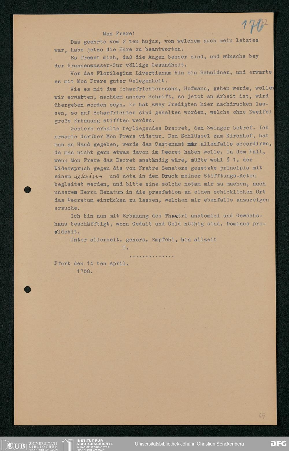 V48 Dr. Senckenbergische Stiftung, 203 - ... Transkriptionen der Briefe Johann Christian Senckenbergs an seinen Bruder Heinrich Christian von Senckenberg in Wien, Bd. 2