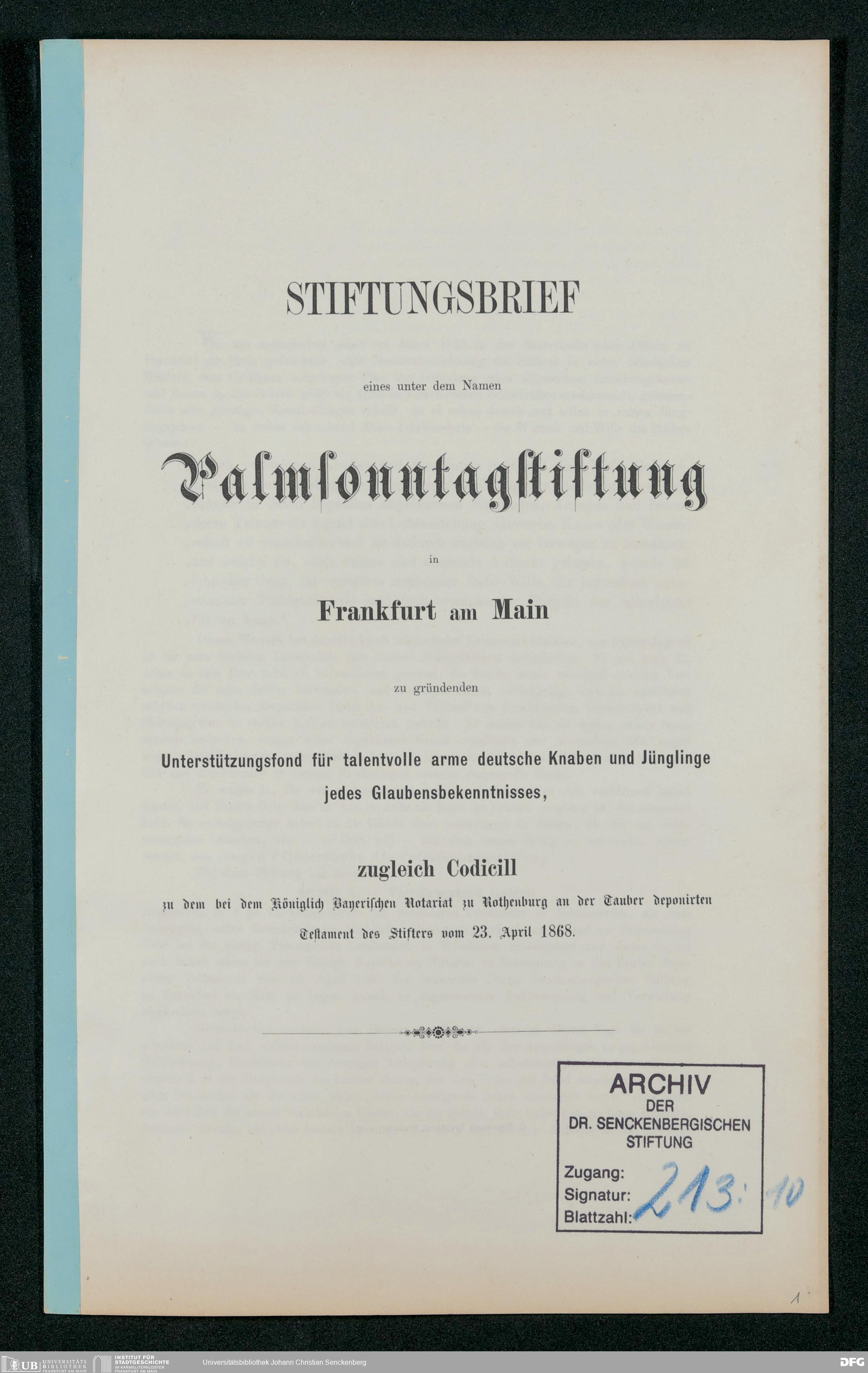 V48 Dr. Senckenbergische Stiftung, 213 - Stiftungsbrief eines unter dem Namen Palmsonntagstiftung in Frankfurt am Main zu gründenden Unterstützungsfond für talentvolle arme deutsche Knaben und Jünglinge jedes Glaubensbekenntnisses, Frankfurt 1869