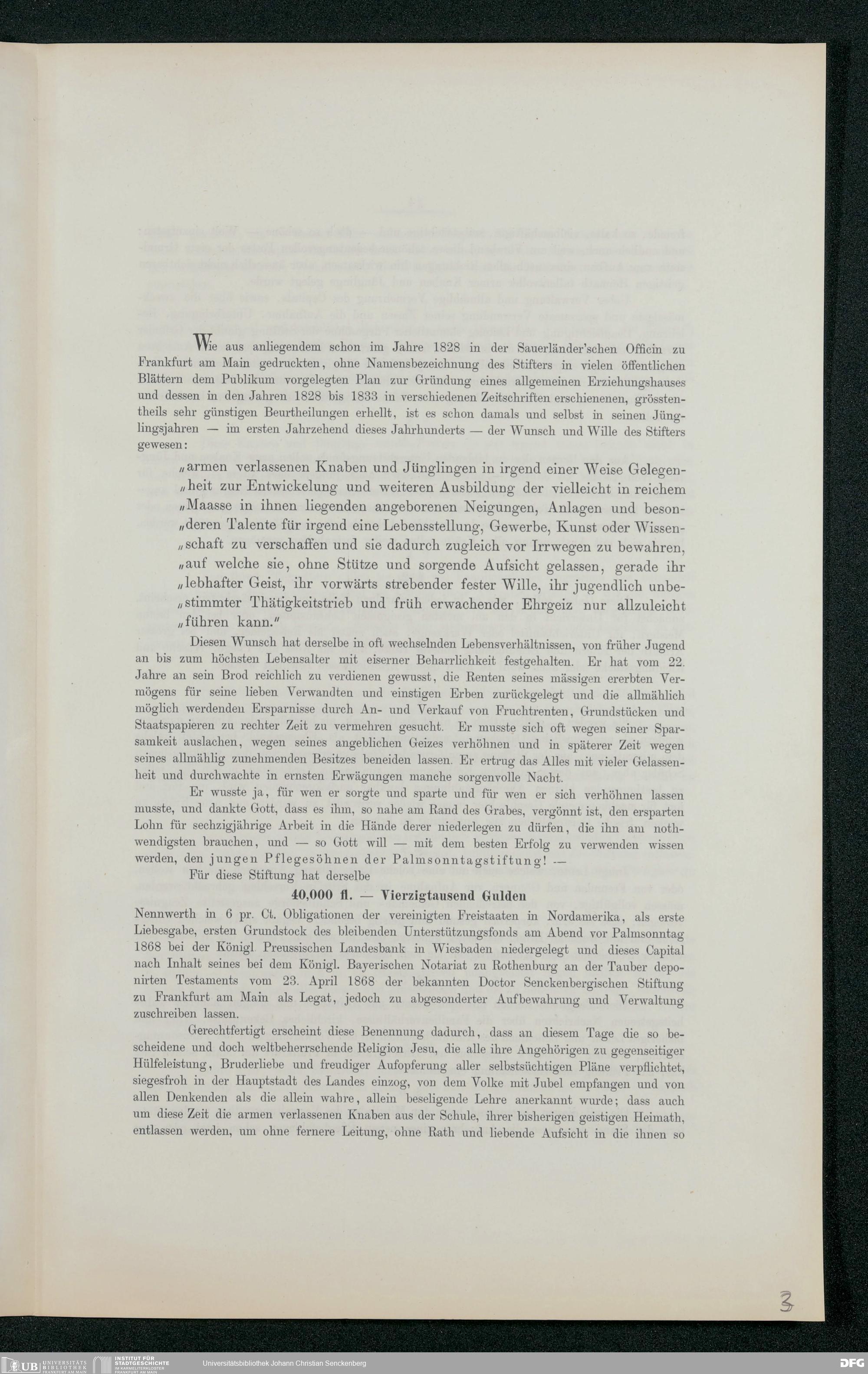 V48 Dr. Senckenbergische Stiftung, 213 - Stiftungsbrief eines unter dem Namen Palmsonntagstiftung in Frankfurt am Main zu gründenden Unterstützungsfond für talentvolle arme deutsche Knaben und Jünglinge jedes Glaubensbekenntnisses, Frankfurt 1869