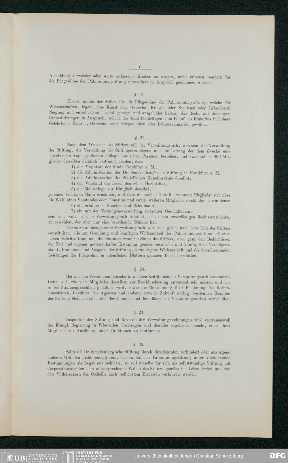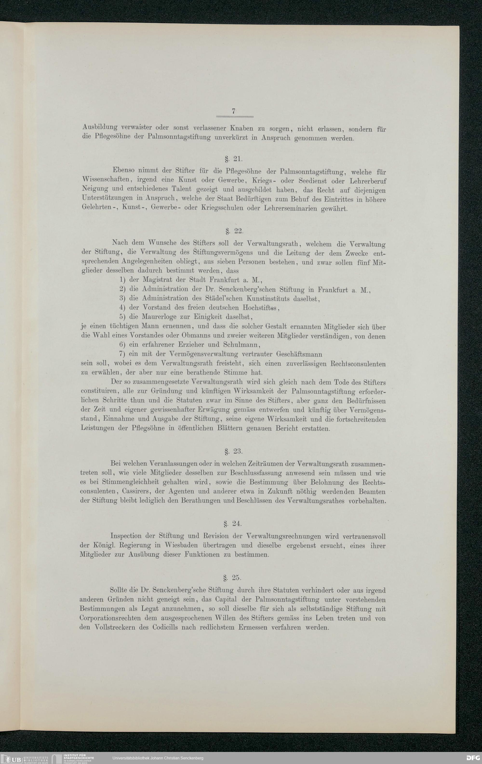 V48 Dr. Senckenbergische Stiftung, 213 - Stiftungsbrief eines unter dem Namen Palmsonntagstiftung in Frankfurt am Main zu gründenden Unterstützungsfond für talentvolle arme deutsche Knaben und Jünglinge jedes Glaubensbekenntnisses, Frankfurt 1869