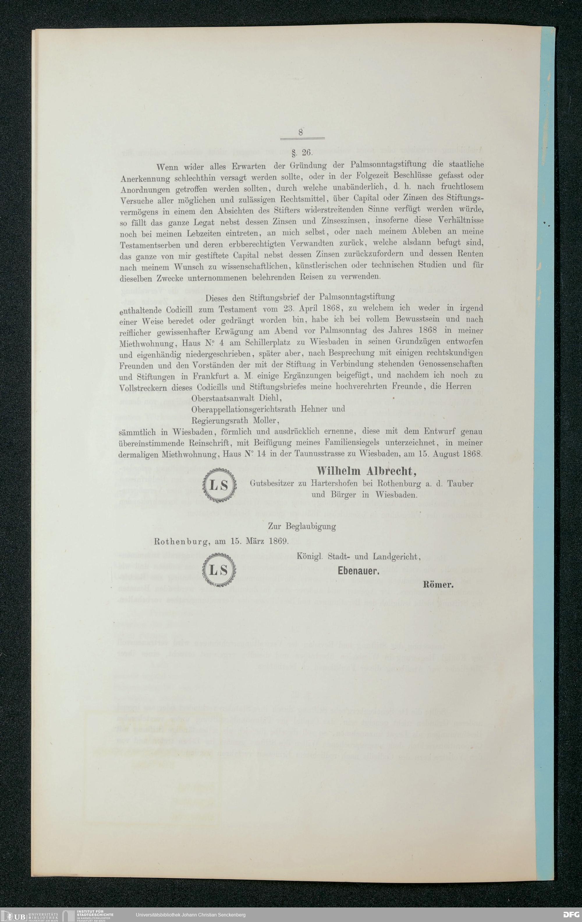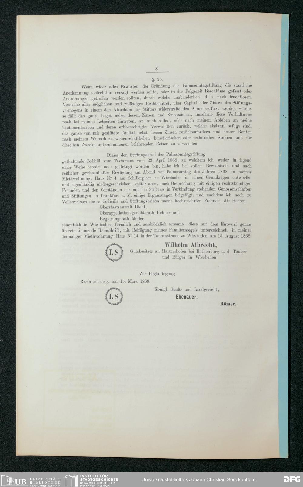 V48 Dr. Senckenbergische Stiftung, 213 - Stiftungsbrief eines unter dem Namen Palmsonntagstiftung in Frankfurt am Main zu gründenden Unterstützungsfond für talentvolle arme deutsche Knaben und Jünglinge jedes Glaubensbekenntnisses, Frankfurt 1869