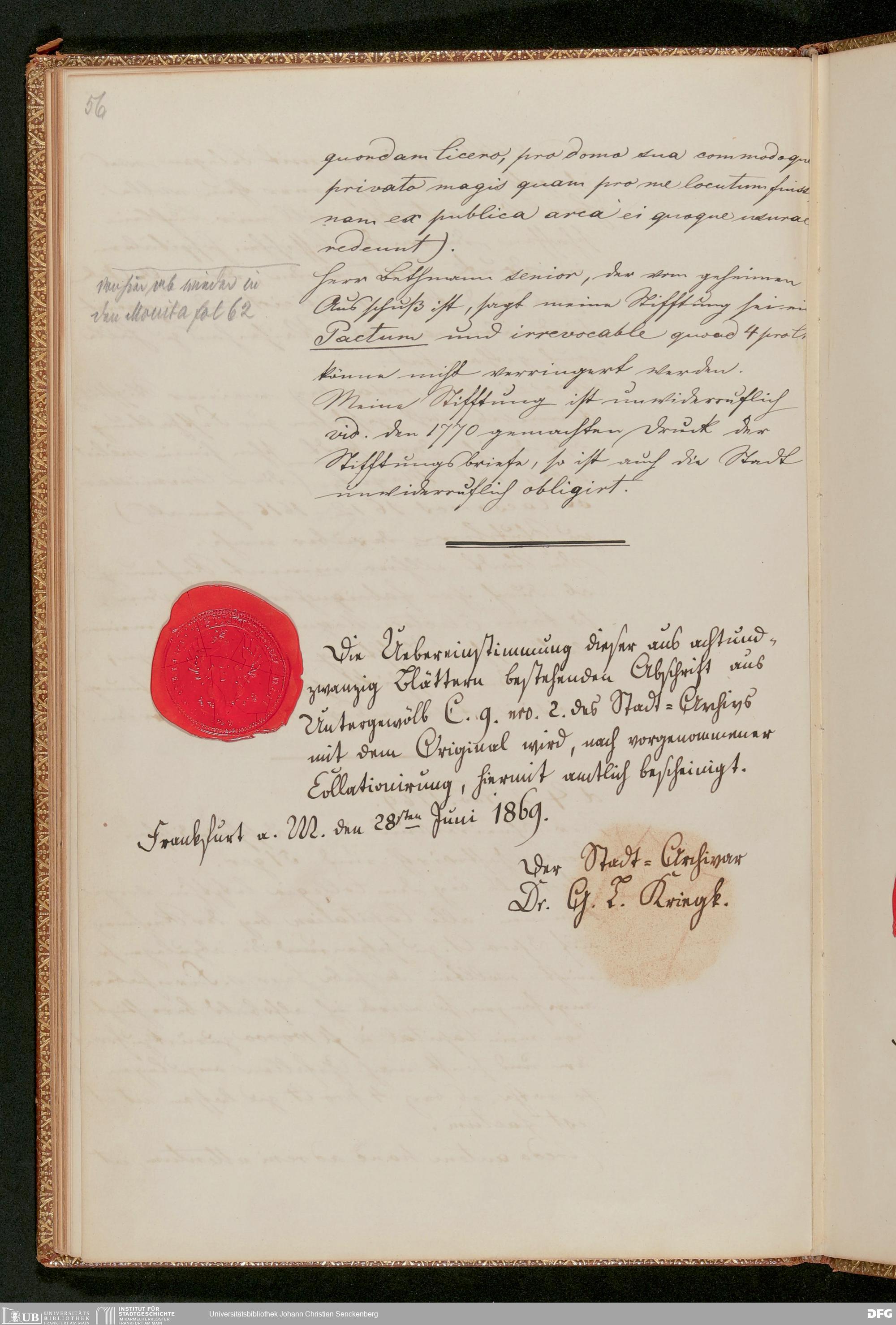 V48 Dr. Senckenbergische Stiftung, 230 - "Senckenbergische Zusätze und Notamina zu seinem Stiftungsbrief (1749-1769) aus dem Stadtarchiv Ugb C. g. No. 2" (von Stadtarchivar Georg Ludwig Kriegk am 28. Juni 1869 beglaubigte Abschrift)