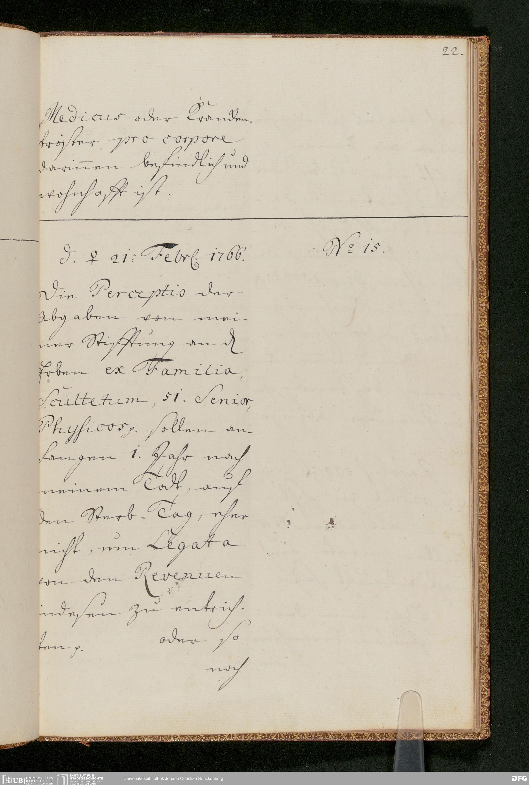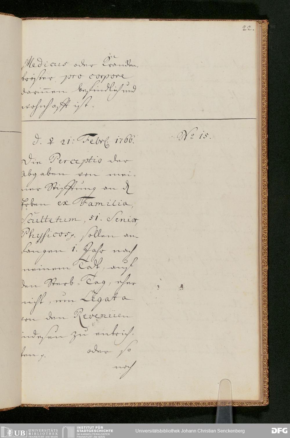 V48 Dr. Senckenbergische Stiftung, 231 - "Monita und Notamina an meine Herren Executores und das Collegium Medicum zur Nachricht, Execution und Befolgung. In Supplementum des Testamenti und respective Donations- und Stiftungs-Instrumenti d. d. 18. August 1763 in specie deßen § 18", Mai 1764