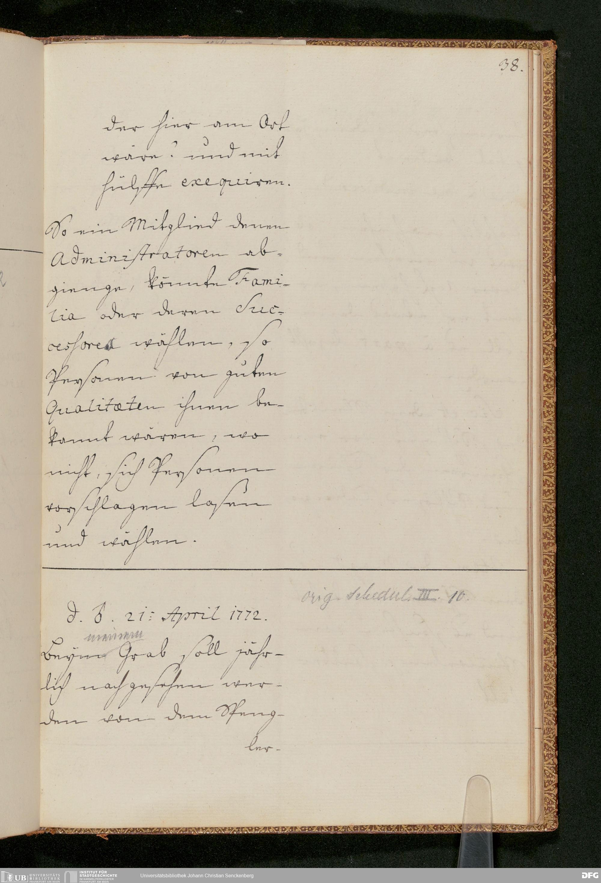 V48 Dr. Senckenbergische Stiftung, 231 - "Monita und Notamina an meine Herren Executores und das Collegium Medicum zur Nachricht, Execution und Befolgung. In Supplementum des Testamenti und respective Donations- und Stiftungs-Instrumenti d. d. 18. August 1763 in specie deßen § 18", Mai 1764