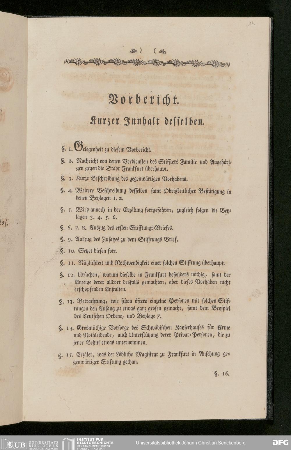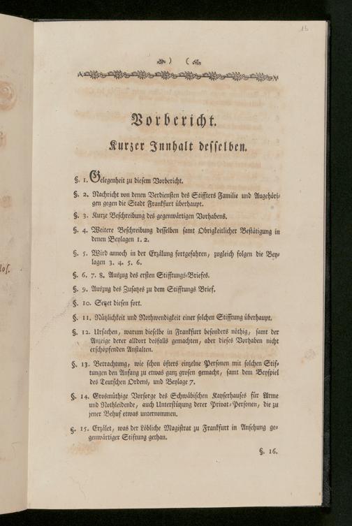 V48 Dr. Senckenbergische Stiftung, 233 - Stiftungsbrief: "Johann Christian Senckenberg Medicinae Doctoris und Physici Ordinarii zu Frankfurt Stiftungs-Briefe zum Besten der Artzneykunst und Armenpflege; Samt Nachricht wegen eines zu unternehmenden Buerger- und Beysassen-Hospitals zum Behufe der Stadt Frankfurt. Nebst Vorbericht Renat Leopold Christian Carl Freyherrn von Senckenberg; Mit Beylagen und zwoen Kupfer-Tabellen", Frankfurt a. M. 1770