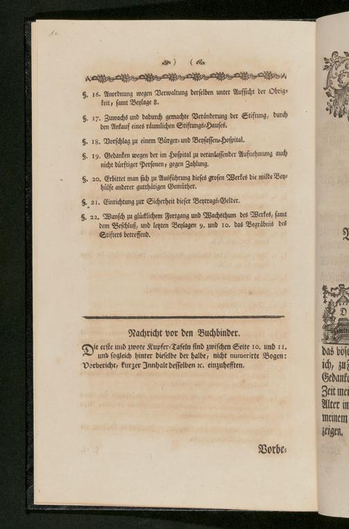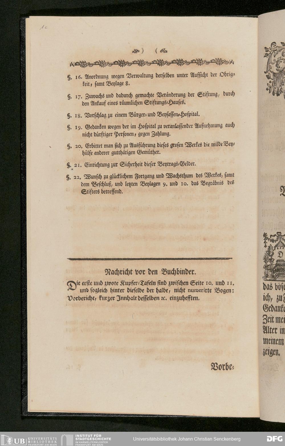 V48 Dr. Senckenbergische Stiftung, 233 - Stiftungsbrief: "Johann Christian Senckenberg Medicinae Doctoris und Physici Ordinarii zu Frankfurt Stiftungs-Briefe zum Besten der Artzneykunst und Armenpflege; Samt Nachricht wegen eines zu unternehmenden Buerger- und Beysassen-Hospitals zum Behufe der Stadt Frankfurt. Nebst Vorbericht Renat Leopold Christian Carl Freyherrn von Senckenberg; Mit Beylagen und zwoen Kupfer-Tabellen", Frankfurt a. M. 1770