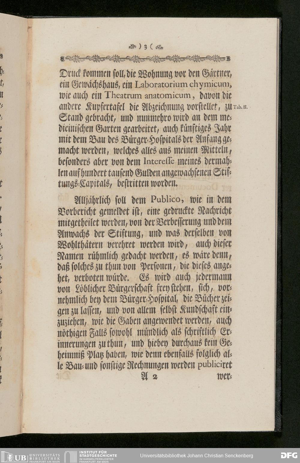 V48 Dr. Senckenbergische Stiftung, 233 - Stiftungsbrief: "Johann Christian Senckenberg Medicinae Doctoris und Physici Ordinarii zu Frankfurt Stiftungs-Briefe zum Besten der Artzneykunst und Armenpflege; Samt Nachricht wegen eines zu unternehmenden Buerger- und Beysassen-Hospitals zum Behufe der Stadt Frankfurt. Nebst Vorbericht Renat Leopold Christian Carl Freyherrn von Senckenberg; Mit Beylagen und zwoen Kupfer-Tabellen", Frankfurt a. M. 1770