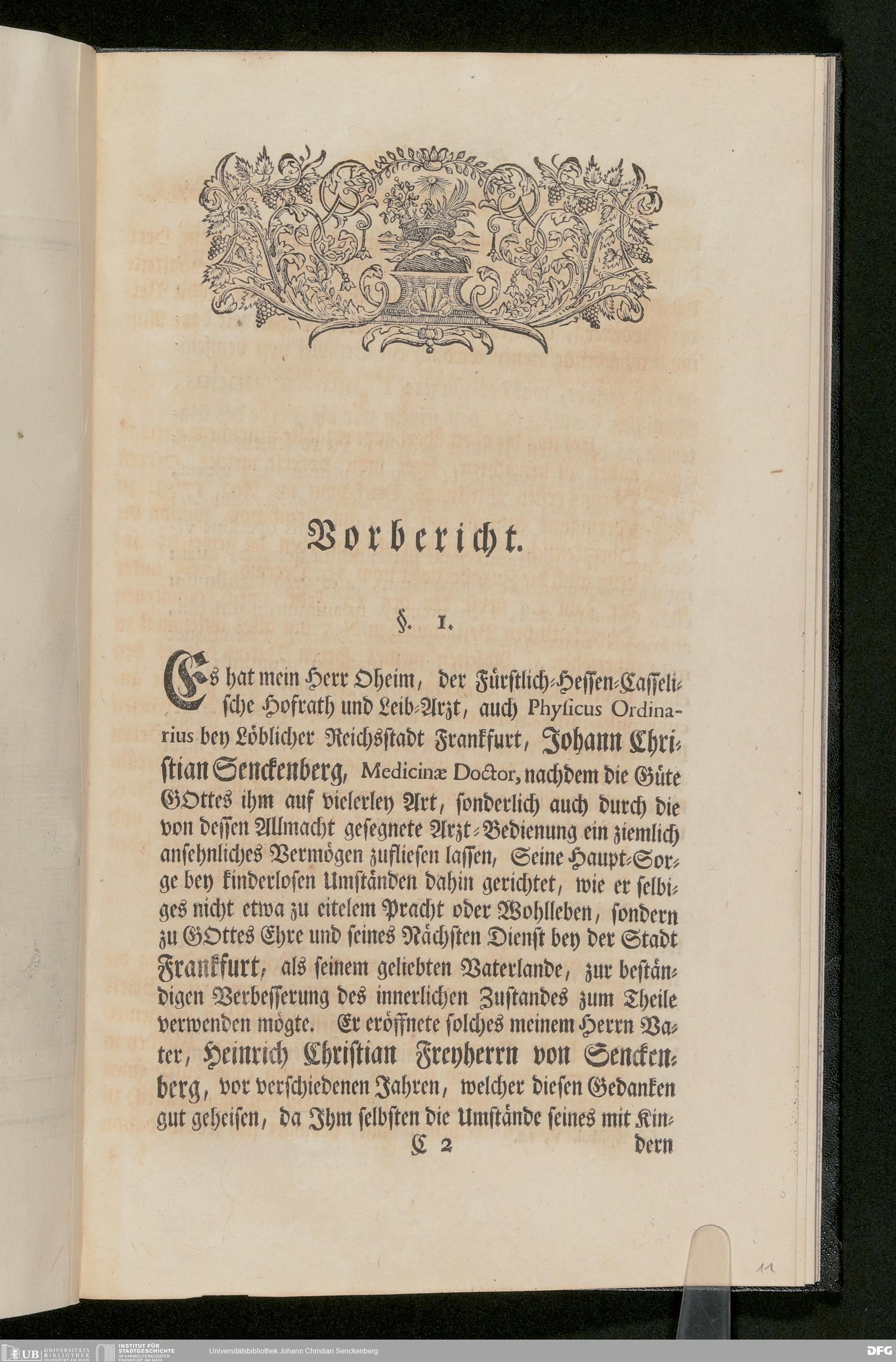 V48 Dr. Senckenbergische Stiftung, 233 - Stiftungsbrief: "Johann Christian Senckenberg Medicinae Doctoris und Physici Ordinarii zu Frankfurt Stiftungs-Briefe zum Besten der Artzneykunst und Armenpflege; Samt Nachricht wegen eines zu unternehmenden Buerger- und Beysassen-Hospitals zum Behufe der Stadt Frankfurt. Nebst Vorbericht Renat Leopold Christian Carl Freyherrn von Senckenberg; Mit Beylagen und zwoen Kupfer-Tabellen", Frankfurt a. M. 1770
