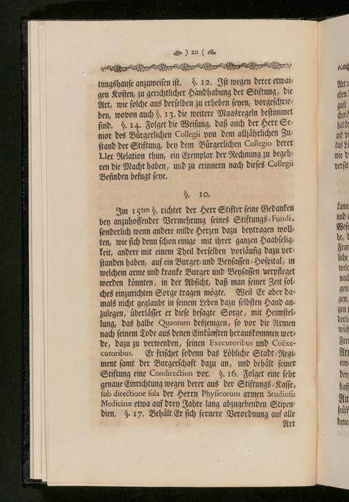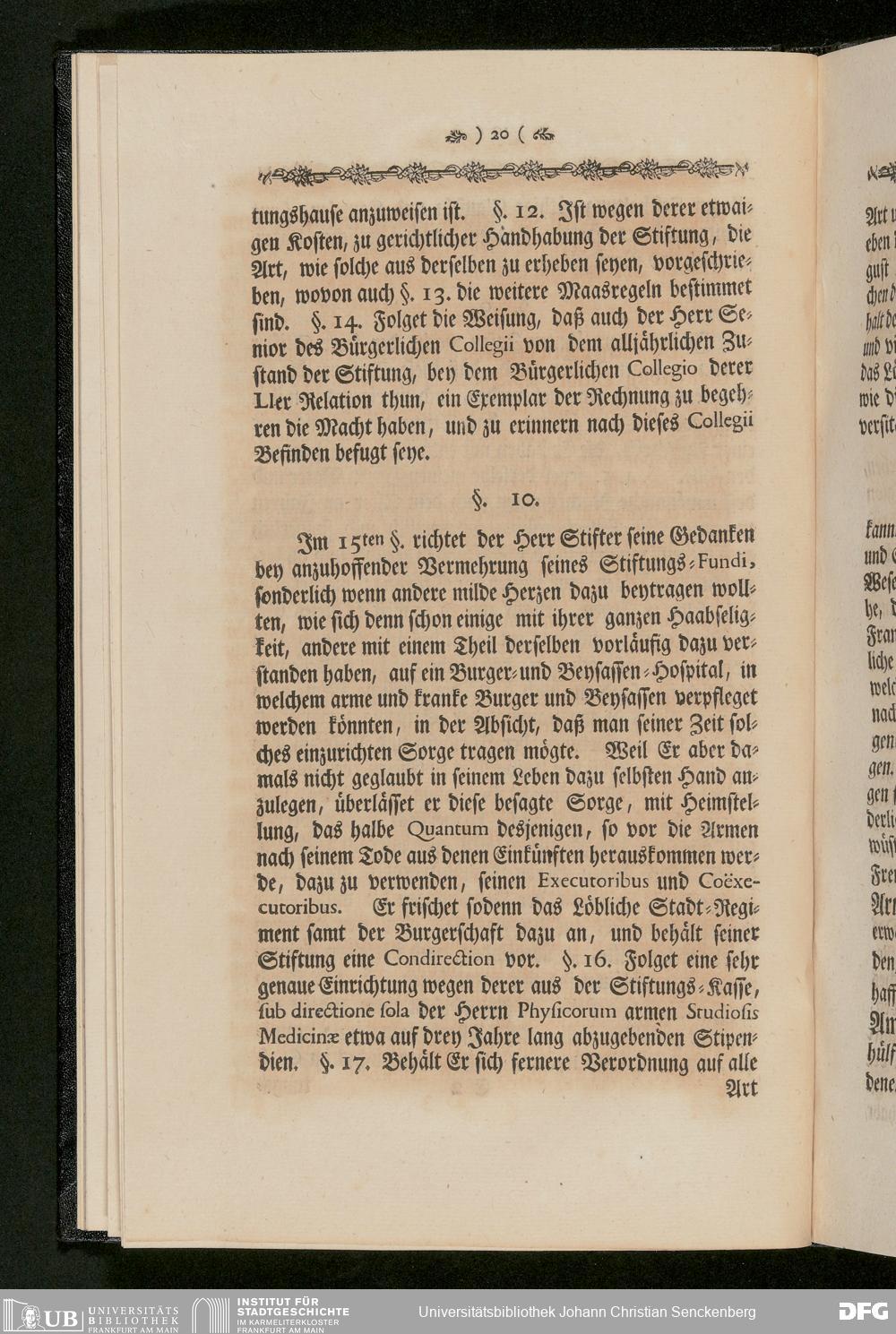 V48 Dr. Senckenbergische Stiftung, 233 - Stiftungsbrief: "Johann Christian Senckenberg Medicinae Doctoris und Physici Ordinarii zu Frankfurt Stiftungs-Briefe zum Besten der Artzneykunst und Armenpflege; Samt Nachricht wegen eines zu unternehmenden Buerger- und Beysassen-Hospitals zum Behufe der Stadt Frankfurt. Nebst Vorbericht Renat Leopold Christian Carl Freyherrn von Senckenberg; Mit Beylagen und zwoen Kupfer-Tabellen", Frankfurt a. M. 1770