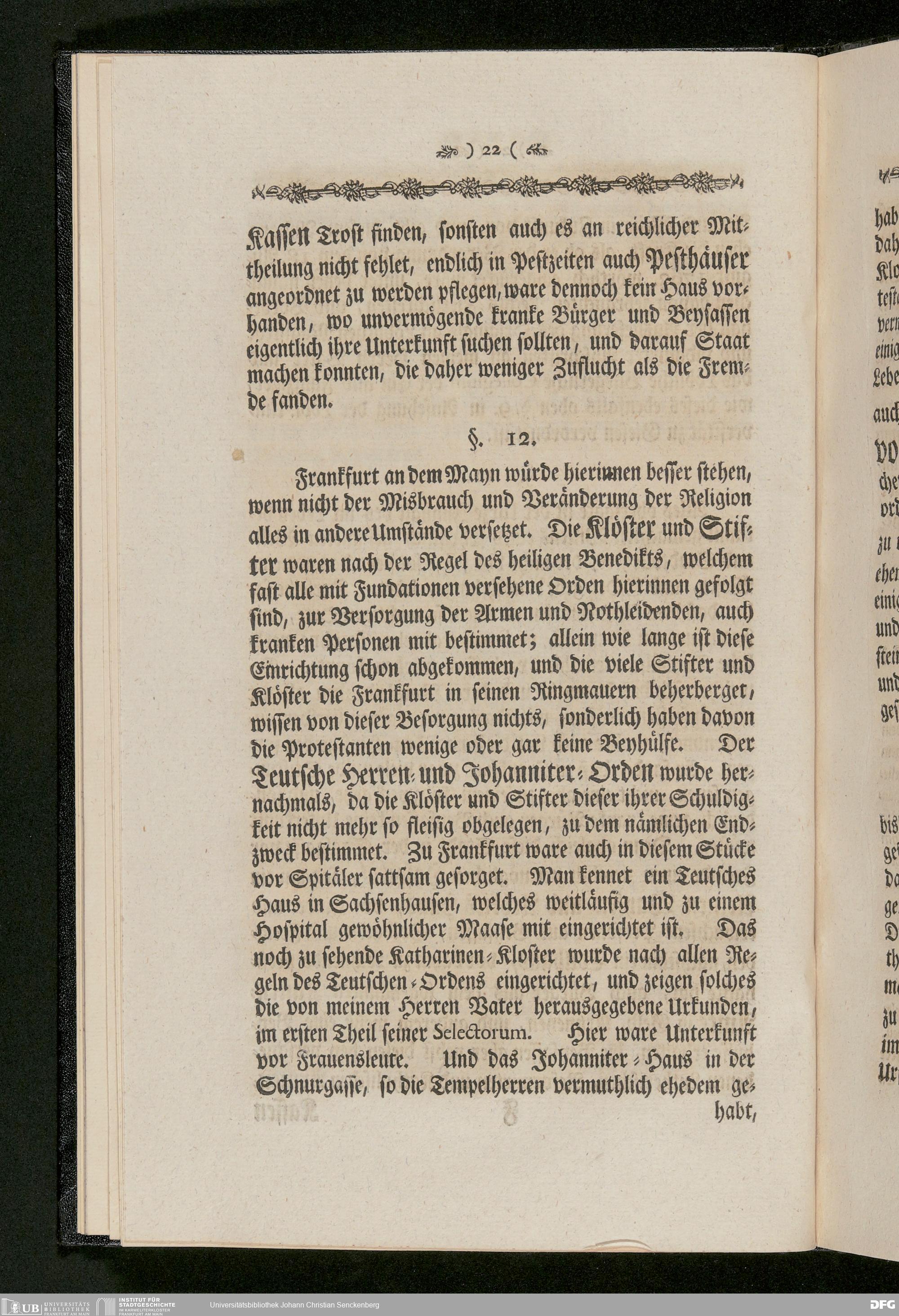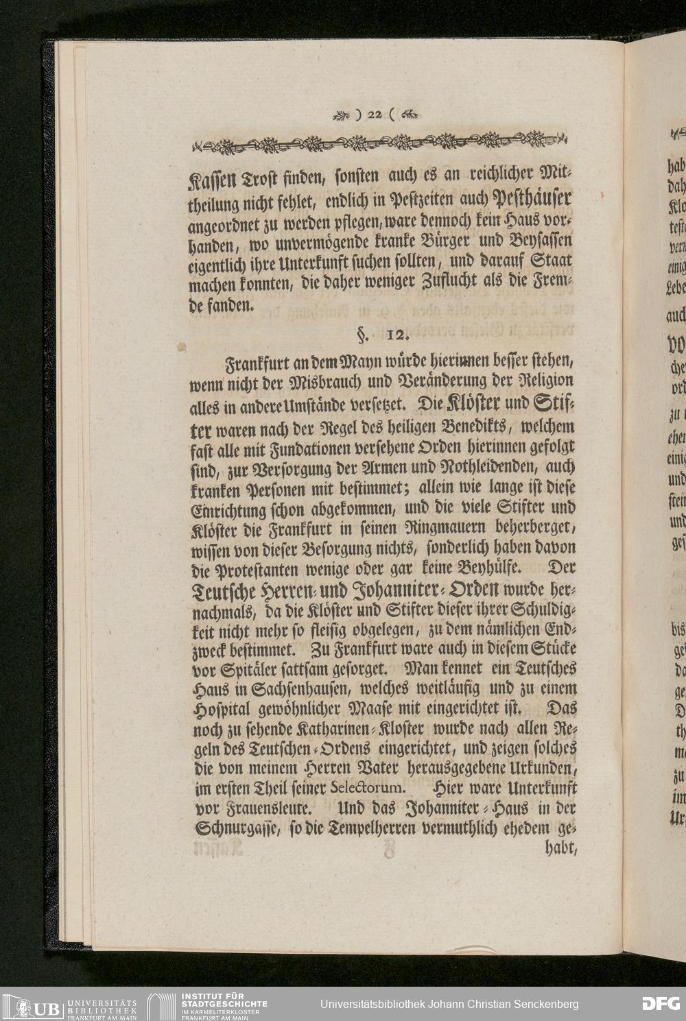 V48 Dr. Senckenbergische Stiftung, 233 - Stiftungsbrief: "Johann Christian Senckenberg Medicinae Doctoris und Physici Ordinarii zu Frankfurt Stiftungs-Briefe zum Besten der Artzneykunst und Armenpflege; Samt Nachricht wegen eines zu unternehmenden Buerger- und Beysassen-Hospitals zum Behufe der Stadt Frankfurt. Nebst Vorbericht Renat Leopold Christian Carl Freyherrn von Senckenberg; Mit Beylagen und zwoen Kupfer-Tabellen", Frankfurt a. M. 1770