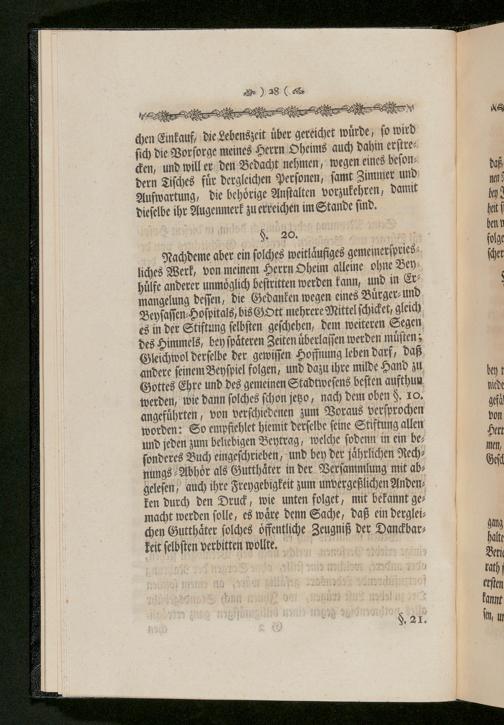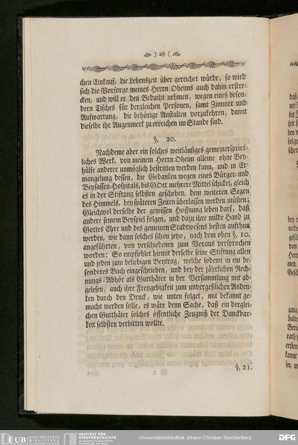 V48 Dr. Senckenbergische Stiftung, 233 - Stiftungsbrief: "Johann Christian Senckenberg Medicinae Doctoris und Physici Ordinarii zu Frankfurt Stiftungs-Briefe zum Besten der Artzneykunst und Armenpflege; Samt Nachricht wegen eines zu unternehmenden Buerger- und Beysassen-Hospitals zum Behufe der Stadt Frankfurt. Nebst Vorbericht Renat Leopold Christian Carl Freyherrn von Senckenberg; Mit Beylagen und zwoen Kupfer-Tabellen", Frankfurt a. M. 1770